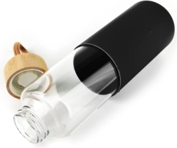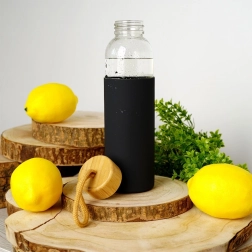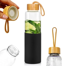 Stilingas ir patvarus stiklinis butelis padės laikytis skysčių režimo namuose, biure ar kelionėse. Borosilikatinis stiklas geriau atlaiko temperatūrų pokyčius, todėl be rūpesčių mėgausitės vandeniu, limonadu, glotnučiais ar karšta arbata. Bambukinis dangtelis su kilpele leidžia patogiai nešiotis ir pakabinti.