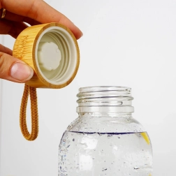 Naturalaus bambuko dangtelis su silikonine sandarinimo įvore apsaugo nuo pratekėjimo, o tekstilinė kilpelė palengvina nešiojimą ir pakabinimą ant kuprinės.