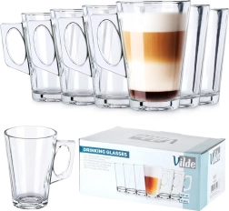 Elegantiškas šešių latės stiklinių rinkinys, 255 ml talpos, su patogia ąsele. Pagamintos iš patvaraus storasienio stiklo, tinka karštiems ir šaltiems gėrimams, galima plauti indaplovėje ir naudoti mikrobangų krosnelėje. Idealiai tinka kavai, arbatai, vandeniui ir limonadams – puikus pasirinkimas namams ir viešbučių bei maitinimo įstaigoms.