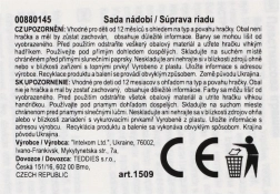 Rinkinyje yra viskas, ko reikia mažam arbatos gėrimui: arbatinukas, puodeliai su lėkštutėmis ir šaukšteliai linksmomis spalvomis. Pakuotė – praktiškas tinklelis, kuris palengvina laikymą ir nešiojimą. Tinka nuo 12 mėnesių.