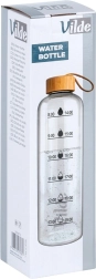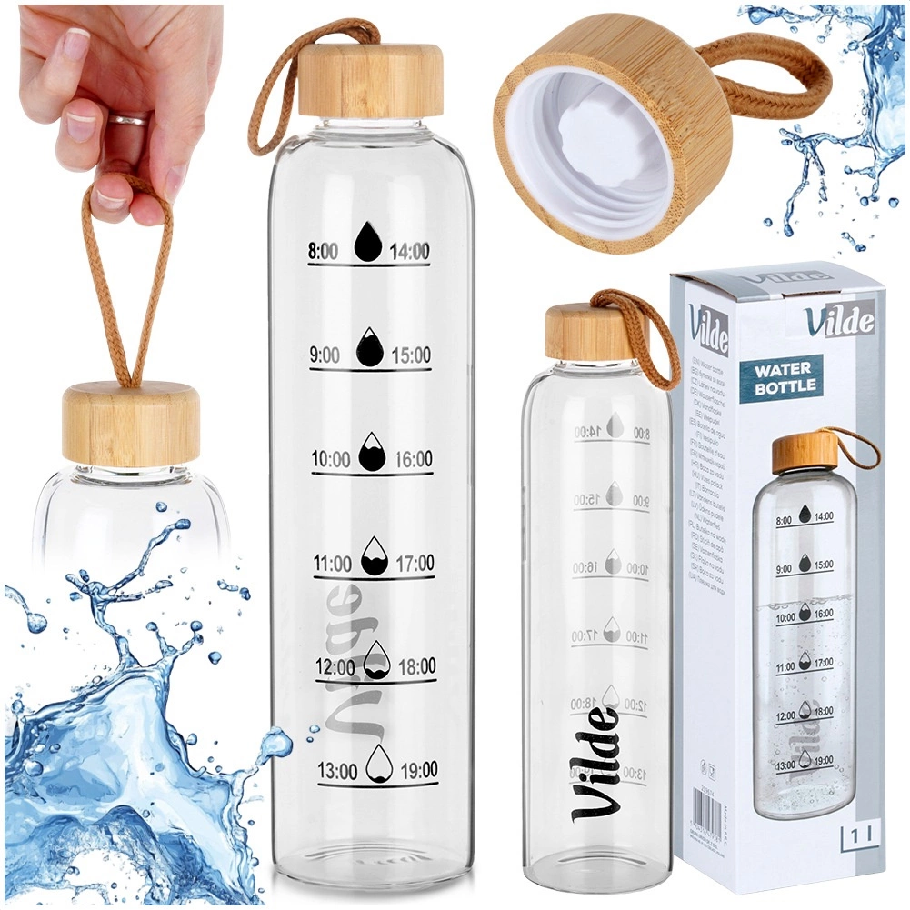 Skaidriame korpuse rasite laiko žymas nuo ryto iki vakaro, padedančias sekti gėrimo režimą. Butelio talpa 1 litras, aukštis apie 29,5 cm ir skersmuo 7,5 cm – idealiai tinka biurui, kelionėms ir sportui. Paprastą priežiūrą užtikrina galimybė plauti indaplovėje.
