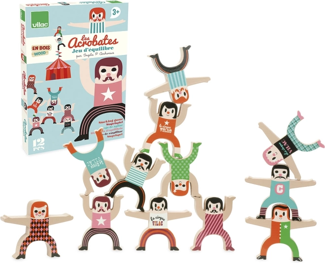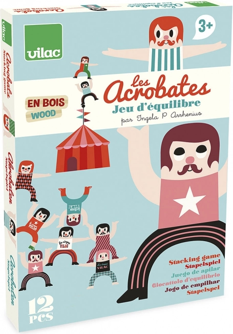 Smagus dvylikos medinių akrobatų rinkinys iš VILAC siūlo išradingą balansavimo žaidimą visai šeimai. Vaikai ir suaugusieji su džiaugsmu dėlios figūrėles vieną ant kitos ir bandys įvairias formacijas. Žaidimas lavina kantrybę, loginį mąstymą, smulkiąją motoriką ir kūrybiškumą. Originalią išvaizdą suteikia iliustracijos, sukurtos Ingela P. Arrhenius.