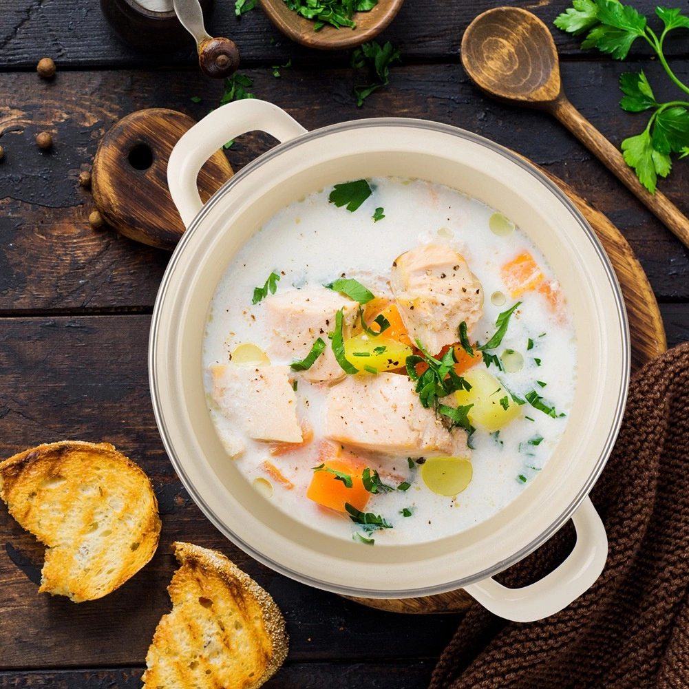 - Universalus naudojimas: virimas, troškinimas, patiekimas tiesiai ant stalo.
