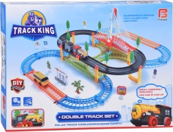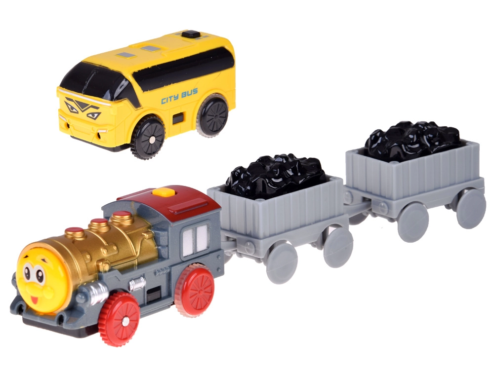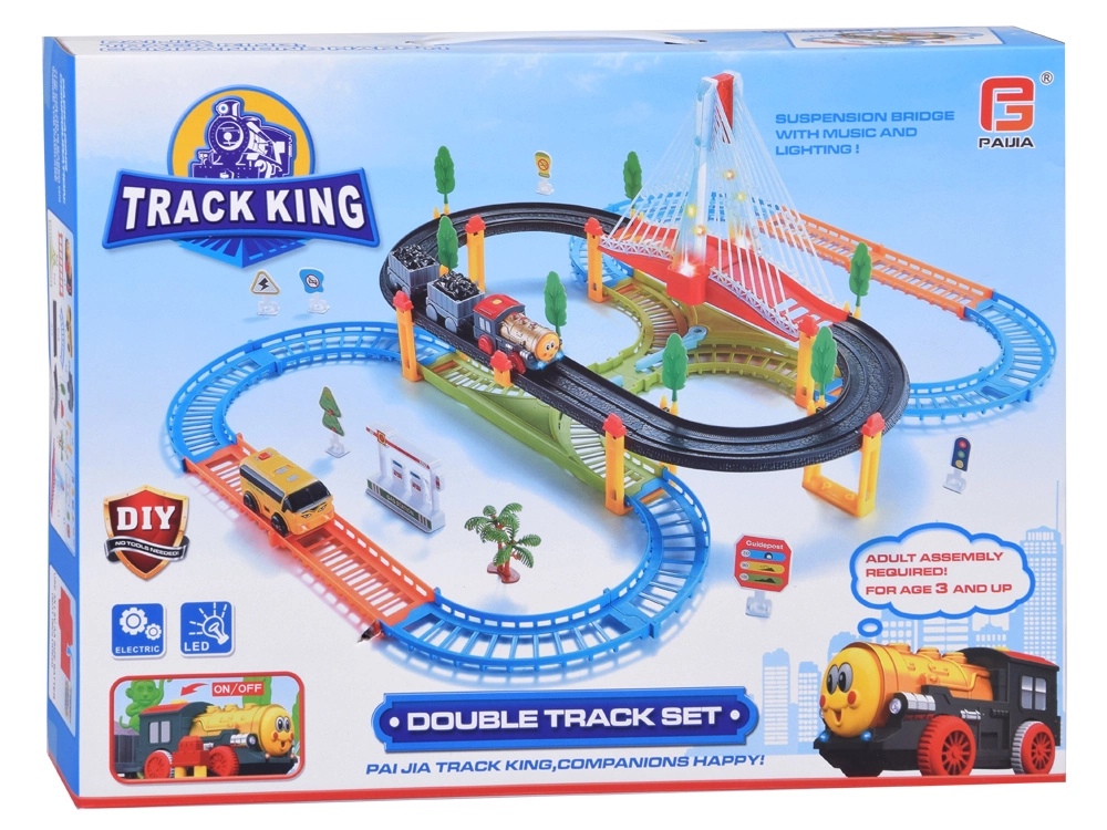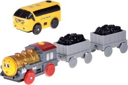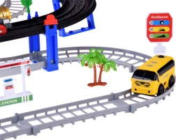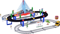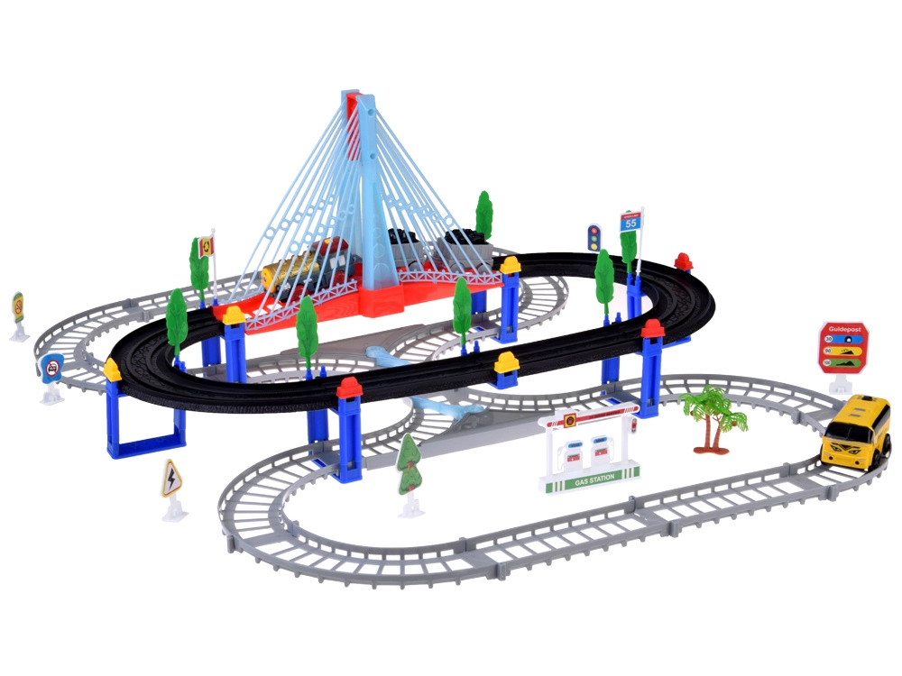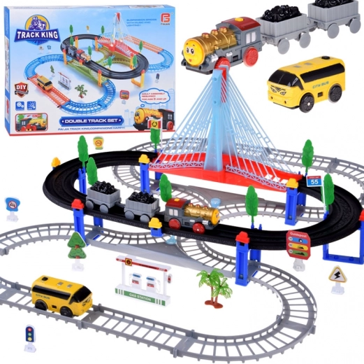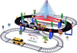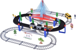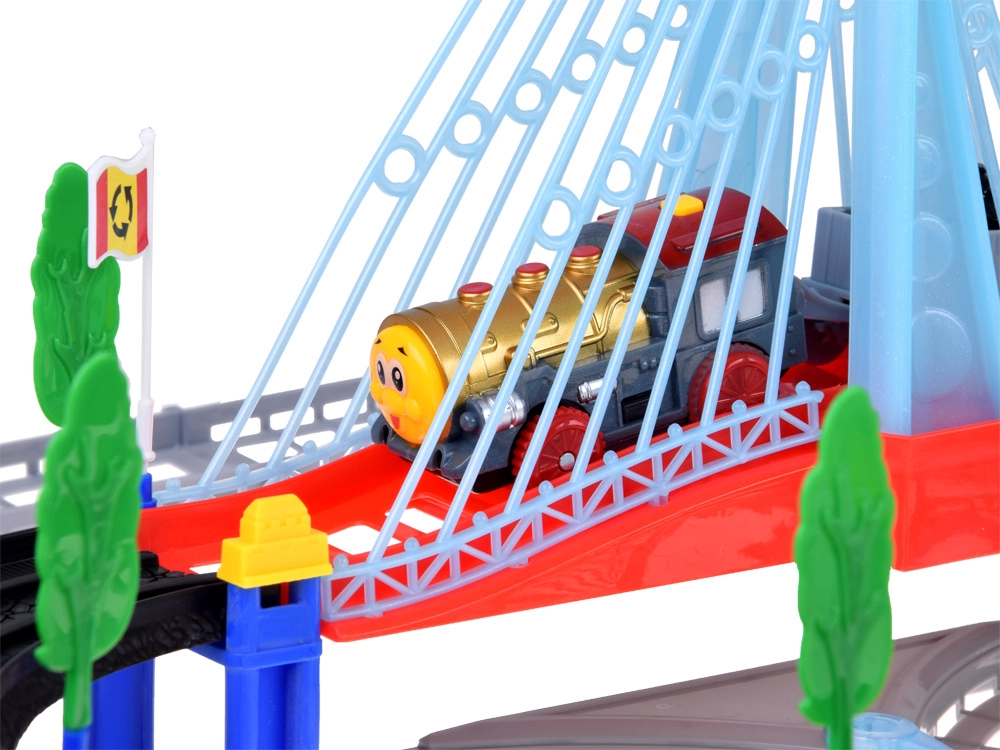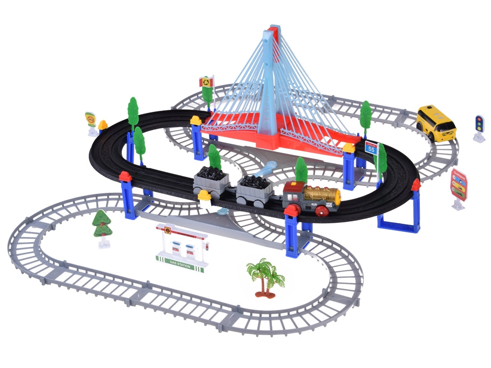 Ši elektrinė traukinių trasa su daugiapakopiais bėgiais ir kabančiu tiltu suteikia vaikams valandas kūrybiško žaidimo. Lokomotyvas su vagonais ir geltonas miesto autobusas juda sujungtomis trasomis, kerta tiltą ir praeina pro kelio ženklus, medelius bei mažą degalinę. LED apšvietimas ir lokomotyvo garsai su melodijomis suteikia žaidimui autentiškumo.