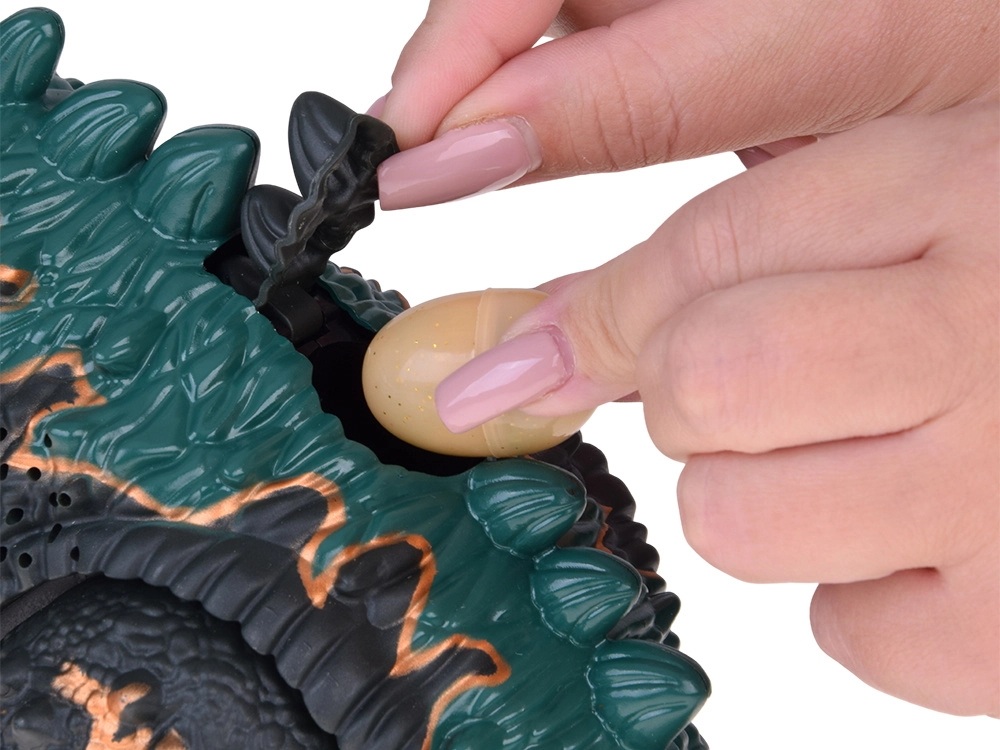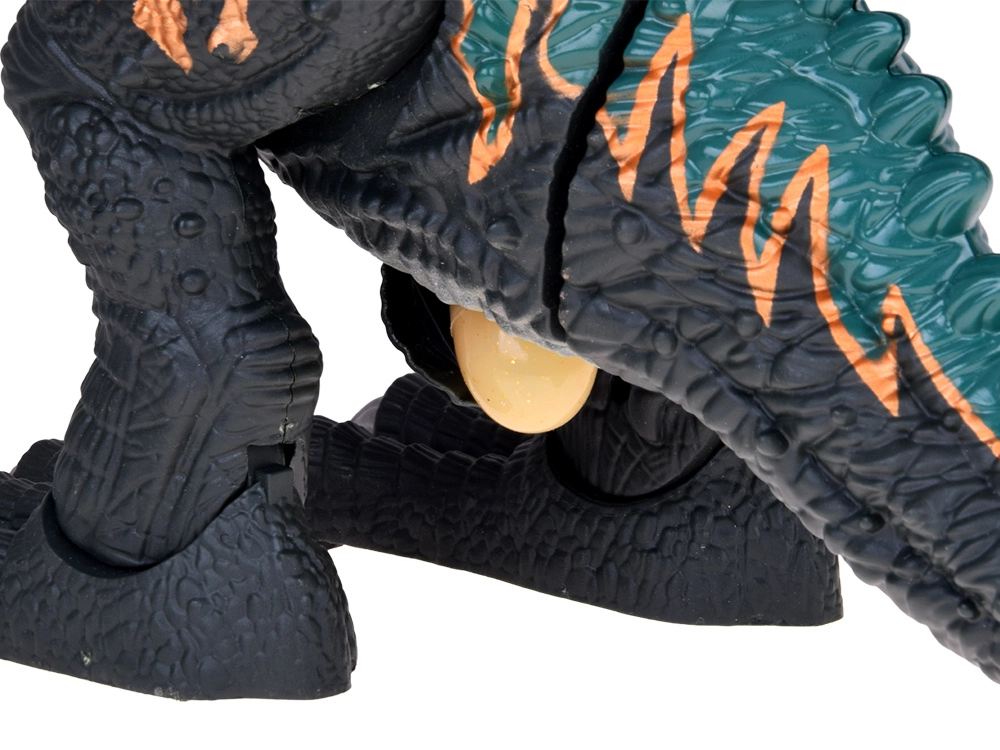 Išskirtinis garų efektas: po juodu smaigaliu ant galvos yra vandens talpykla. Užpildžius pridėtu buteliuku, dinozauras leidžia garus iš nasrų, kuriuos papildomai apšviečia LED, todėl sukuriamas stulbinantis vaizdinis efektas. Ant nugaros yra anga kiaušiniams įdėti – vėliau T‑Rexas juos „padeda“. Rinkinyje rasite 3 atsidarančius kiaušinius su kolekcinėmis jauniklių figūrėlėmis.