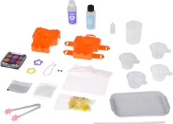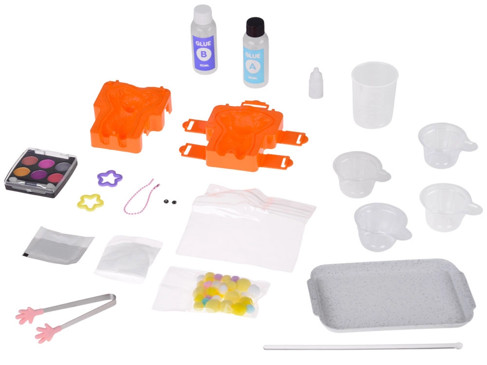 Rinkinį sudaro forma, žnyplės, maišiklis, matuoklis, 2× klijai, pigmentas, dekoracijos, pirštinės ir patogi lėkštelė bei padėklas švariam kūrybos procesui. Paprastas vadovas žingsnis po žingsnio veda vaikus nuo masės sumaišymo iki galutinio dekoravimo ir pakabinimo.