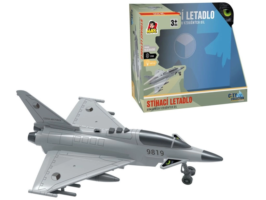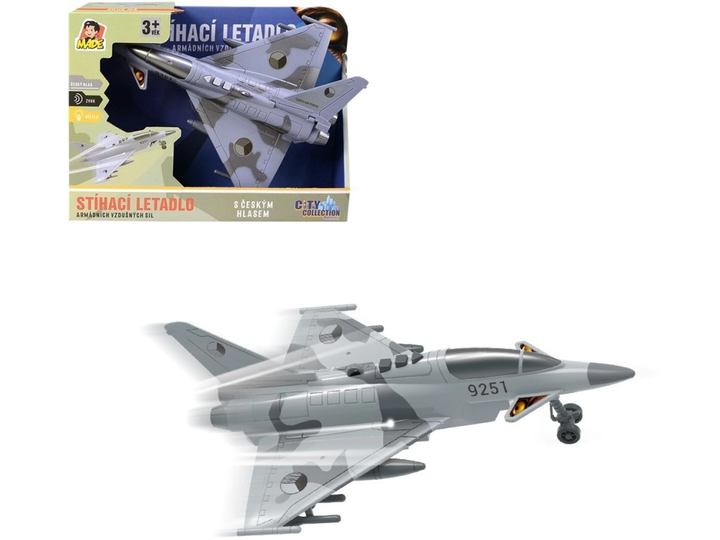 Mėgaukitės įtemptomis oro misijomis su detaliai sukurtu naikintuvu, papuoštu Čekijos Respublikos atpažinimo ženklais. Modelis siūlo autentiškus dialogus čekų kalba tarp valdymo bokšto ir piloto, šviesos efektus ir skriejančio naikintuvo garsą, kurie sustiprina žaidimo atmosferą.