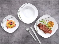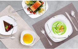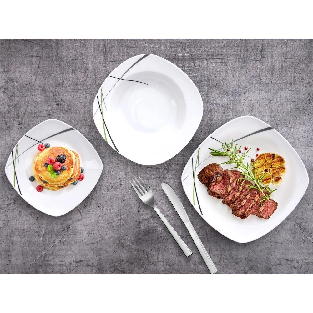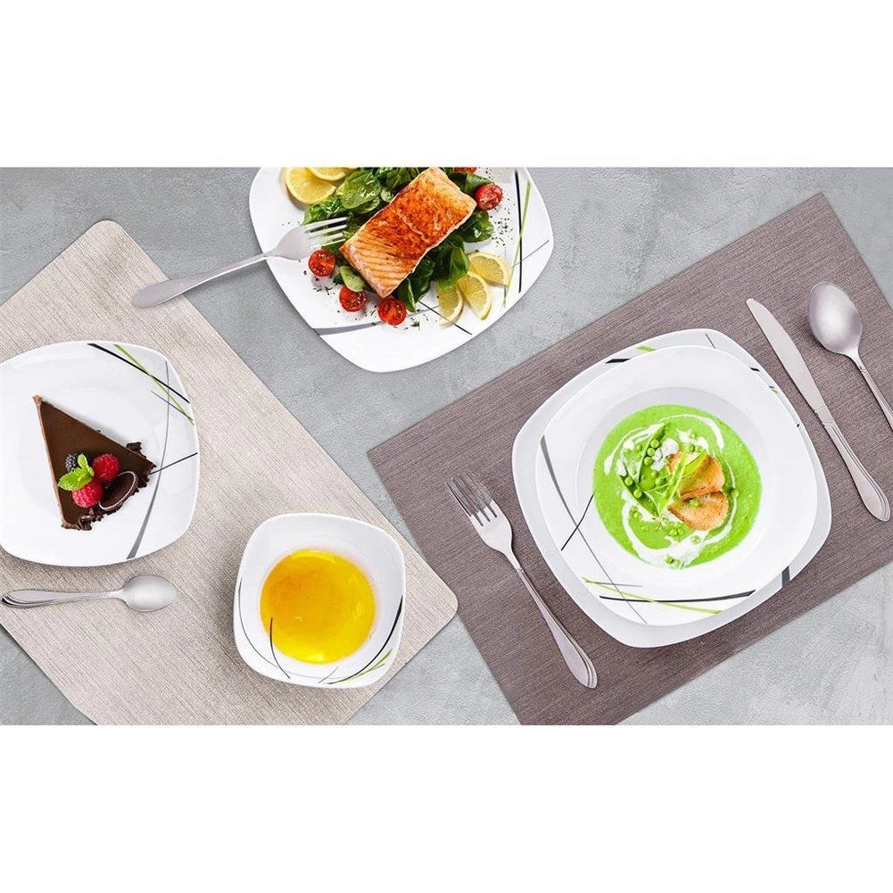 Šis kvadratinis servizas iš kokybiško porceliano suteikia stalui stiliaus ir praktiškumo. Modernus žalias, juodas ir pilkas dekoras puikiai išryškėja ant balto pagrindo ir lengvai derinamas su kita serviravimo įranga. Idealiai tinka pusryčiams, pietums ir vakarienei, puikiai pasitarnaus šeimos susibūrimuose ir šventinėse vaišėse.