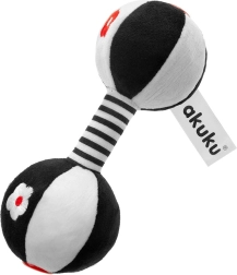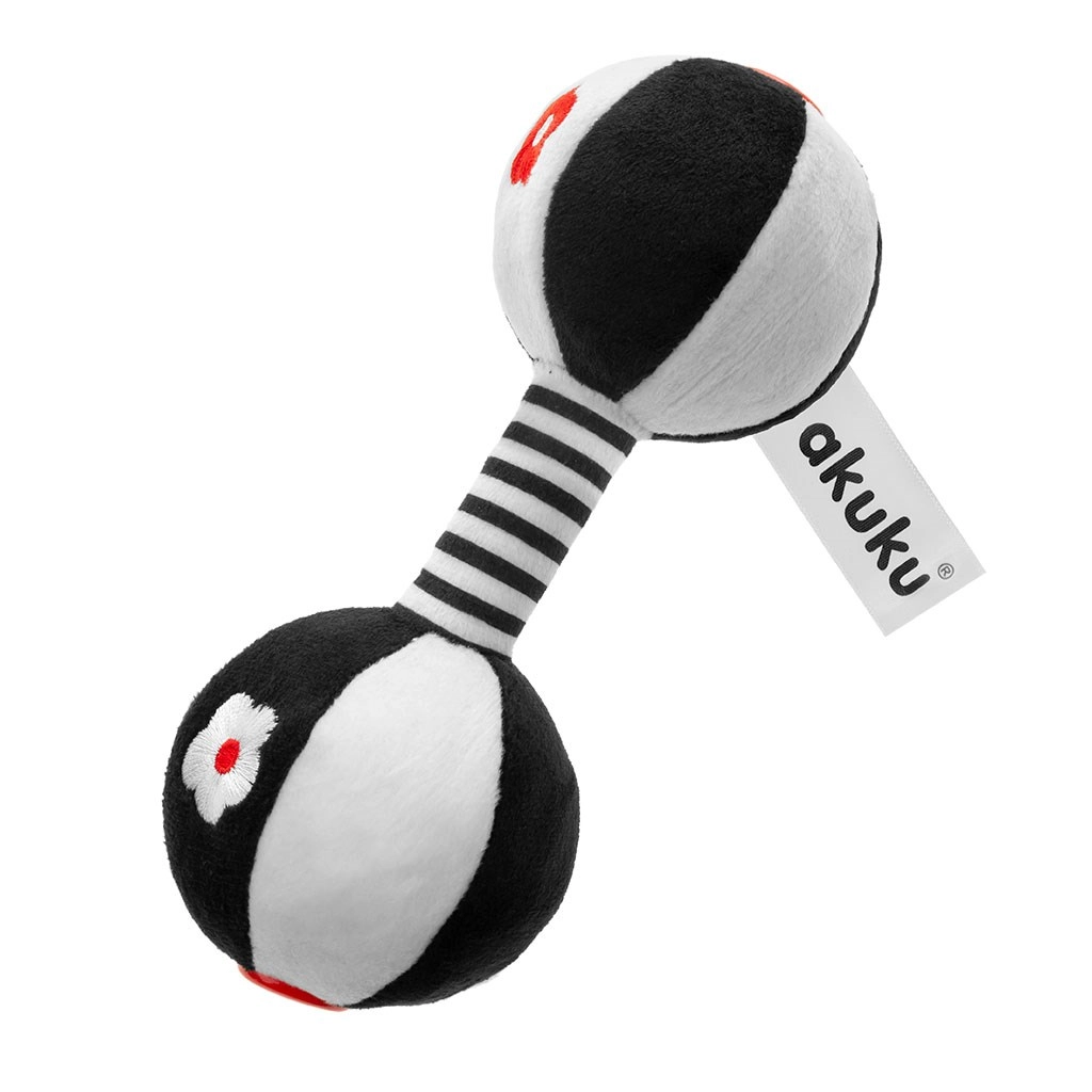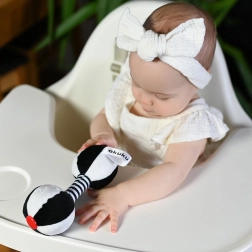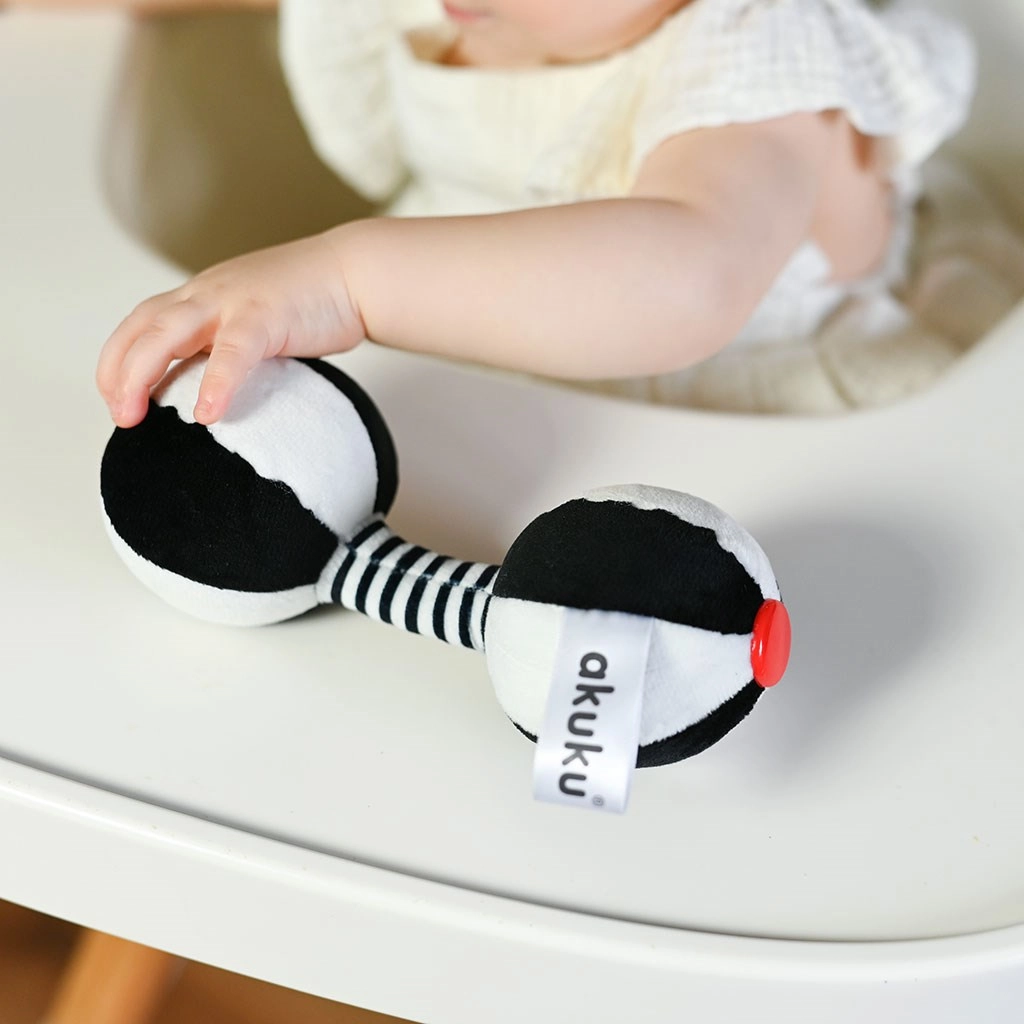 Šis kontrastinis hantelio formos žaislas pagamintas iš malonaus pliušinio audinio, kuris yra švelnus jautriai kūdikio odai. Kontrastingi juodai balti elementai patraukia kūdikio dėmesį ir skatina regimąjį suvokimą nuo pirmųjų dienų. Viduje yra švelnūs varpeliai, kurie judant skleidžia garsą ir padeda lavinti klausos pojūčius.