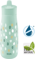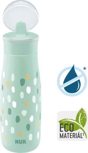 NUK Mini-Me Flip – idealus palydovas mažiesiems nuotykių ieškotojams. Dėl 2 viename kandiklio vaikas gali rinktis gerti per šiaudelį arba tiesiai. Kandiklio medžiaga yra atspari kandžiojimui, todėl lengvai atlaiko pirmuosius dantukus. Buteliukas sukurtas akcentuojant tvarumą ir kokybę – korpusas pagamintas iš 82 % tvarių medžiagų ir neturi BPA.