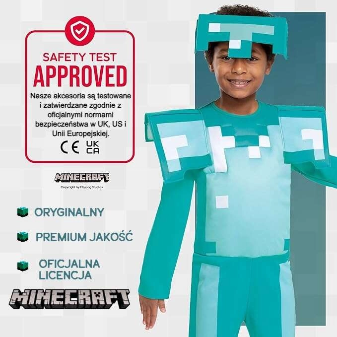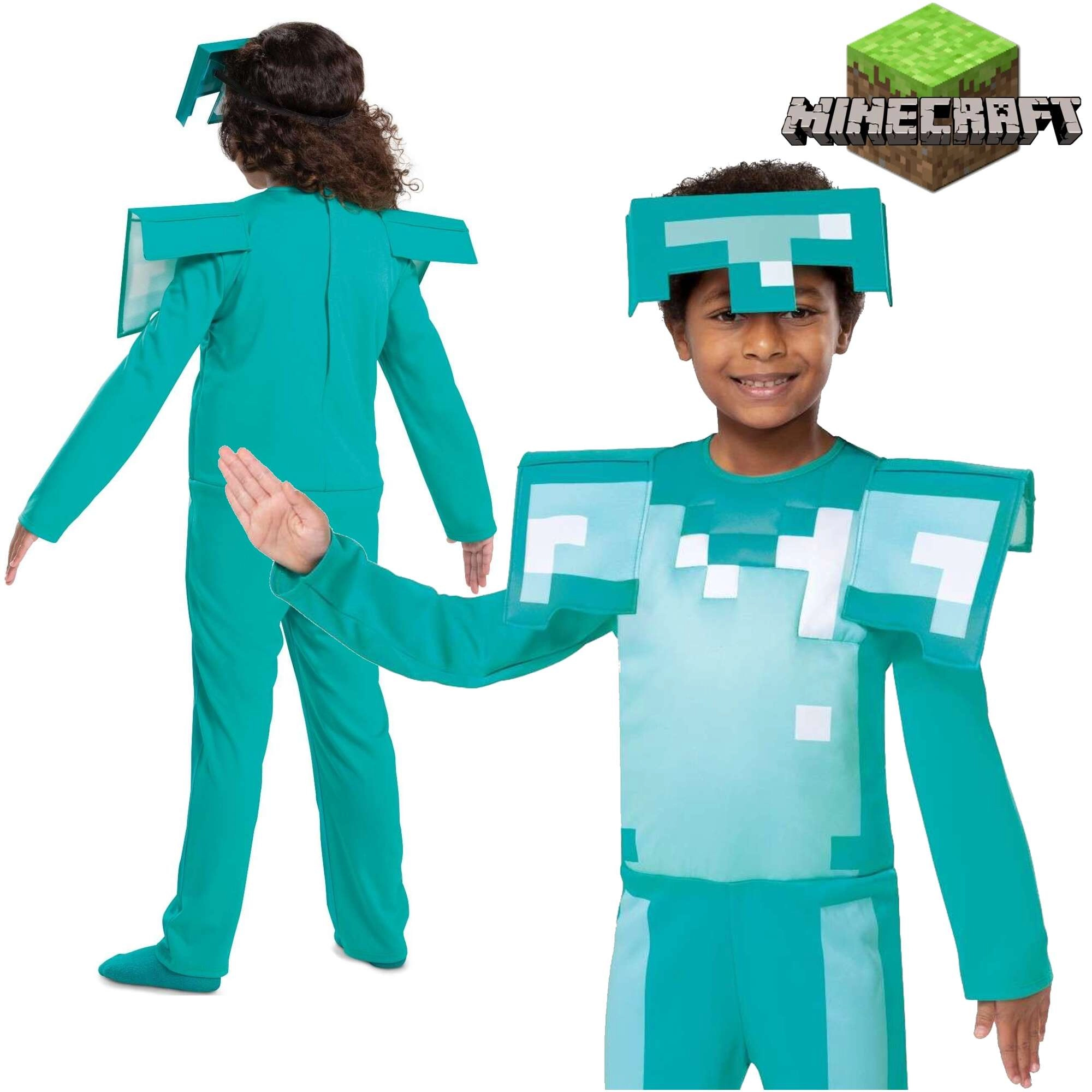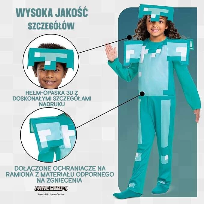 Paverskite mažąjį žaidėją mėgstamos MINECRAFT žaidimo herojumi. Deimantinės šarvuotės kostiumas sužavės autentiška pikseline išvaizda, lengvu šalmu ir pastorintais elementais, kurie suteikia šarvams tikrą „game“ efektą. Dėl patogaus kirpimo ir minkštų įdėklų jį malonu dėvėti net ilgesnio siautėjimo metu.