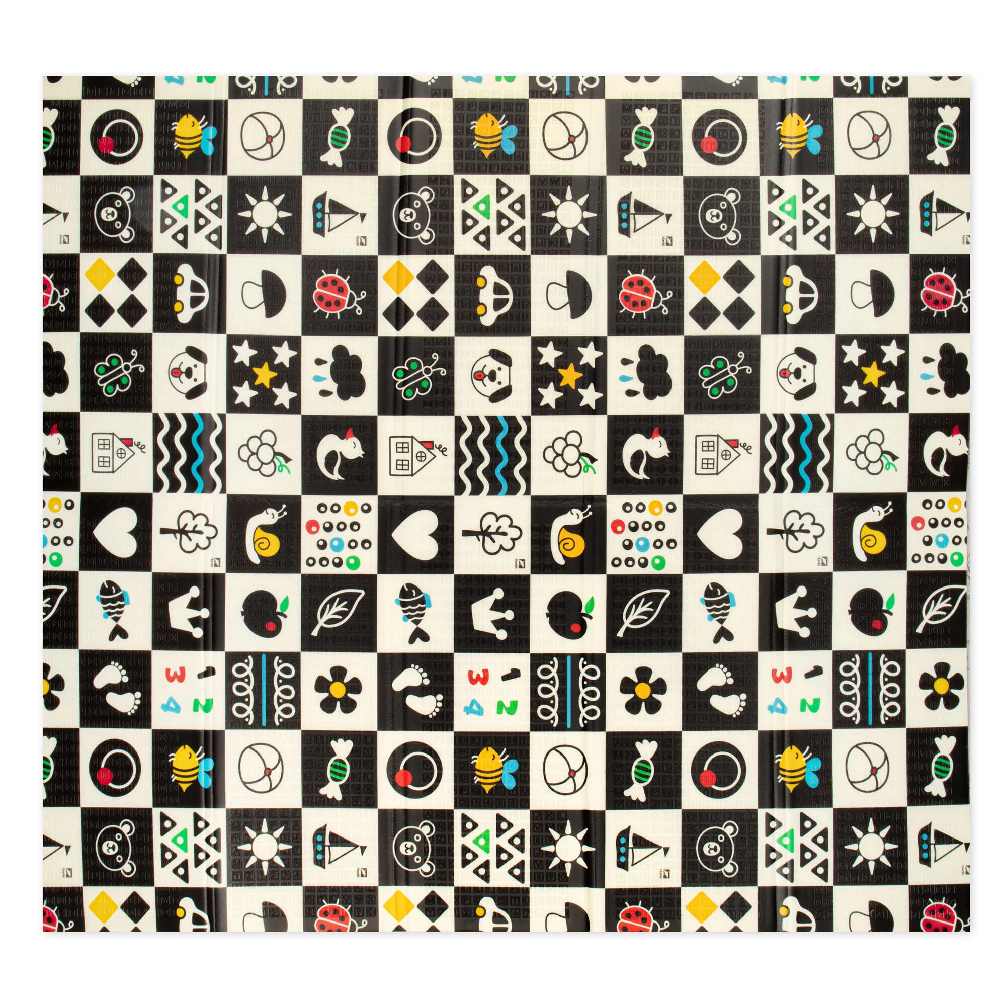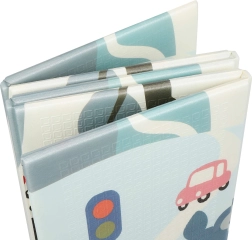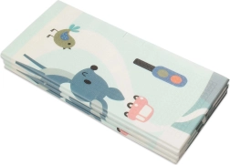 Kiekviena pusė siūlo skirtingą edukacinę grafiką – švelnius gyvūnėlių ir keliuko motyvus arba kontrastinius paveikslėlius vizualinei kūdikių stimulacijai.