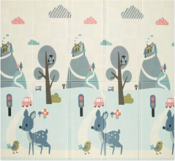 Aukštos kokybės XPE putplastis užtikrina puikų smūgių slopinimą, šilumos izoliaciją nuo šaltų grindų ir ilgą tarnavimo laiką. Abi kilimėlio pusės turi skirtingus, edukacinius atspaudus – švelnų „miško kelią“ su mielais gyvūnėliais ir kontrastinius motyvus vizualinei mažiausiųjų stimulacijai. Dėl neslystančios struktūros jis idealus saugiam žaidimui, „tummy time“ ir mokantis ropoti bei vaikščioti.