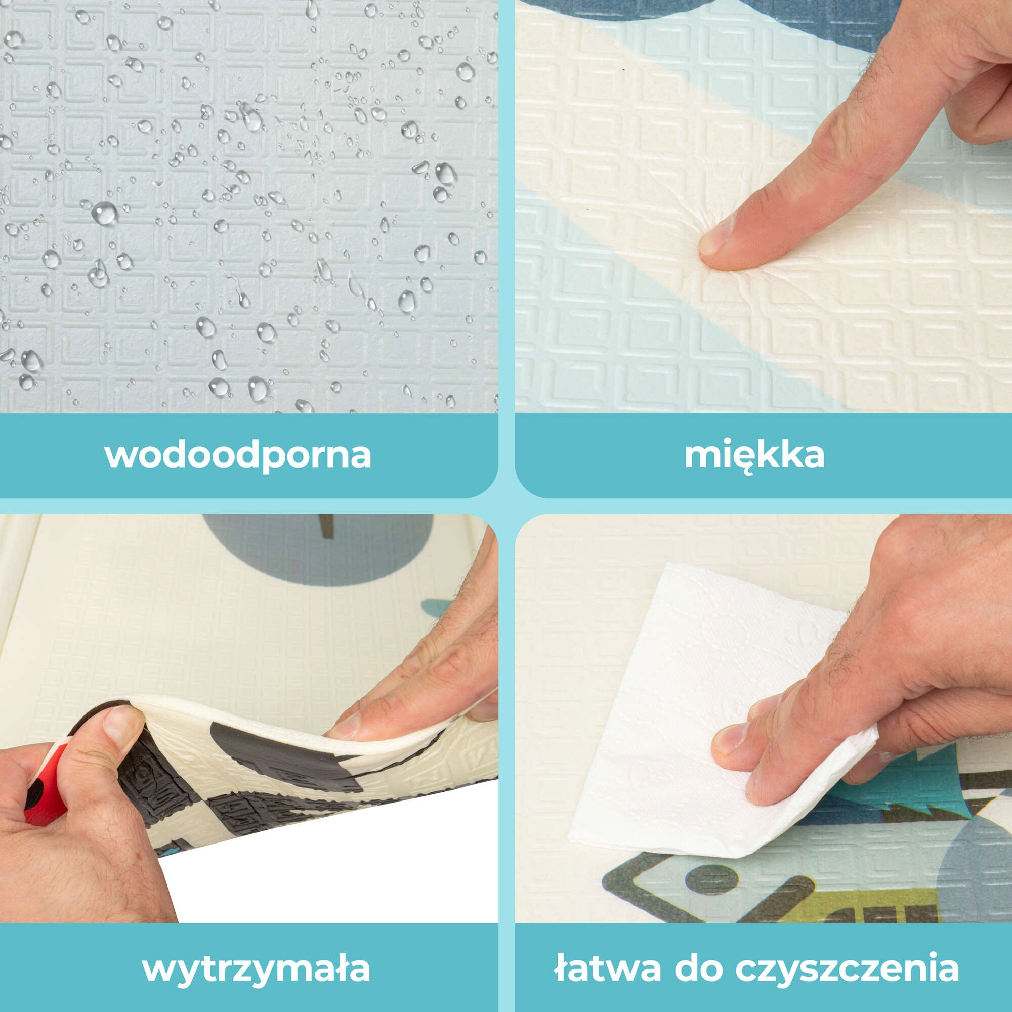 Storas 1 cm XPE sluoksnis puikiai sugeria smūgius, izoliuoja nuo šalčio ir yra bekvapis bei be kenksmingų medžiagų. Tobulas žaidimams, ropojimui ir pirmiesiems žingsniams.