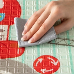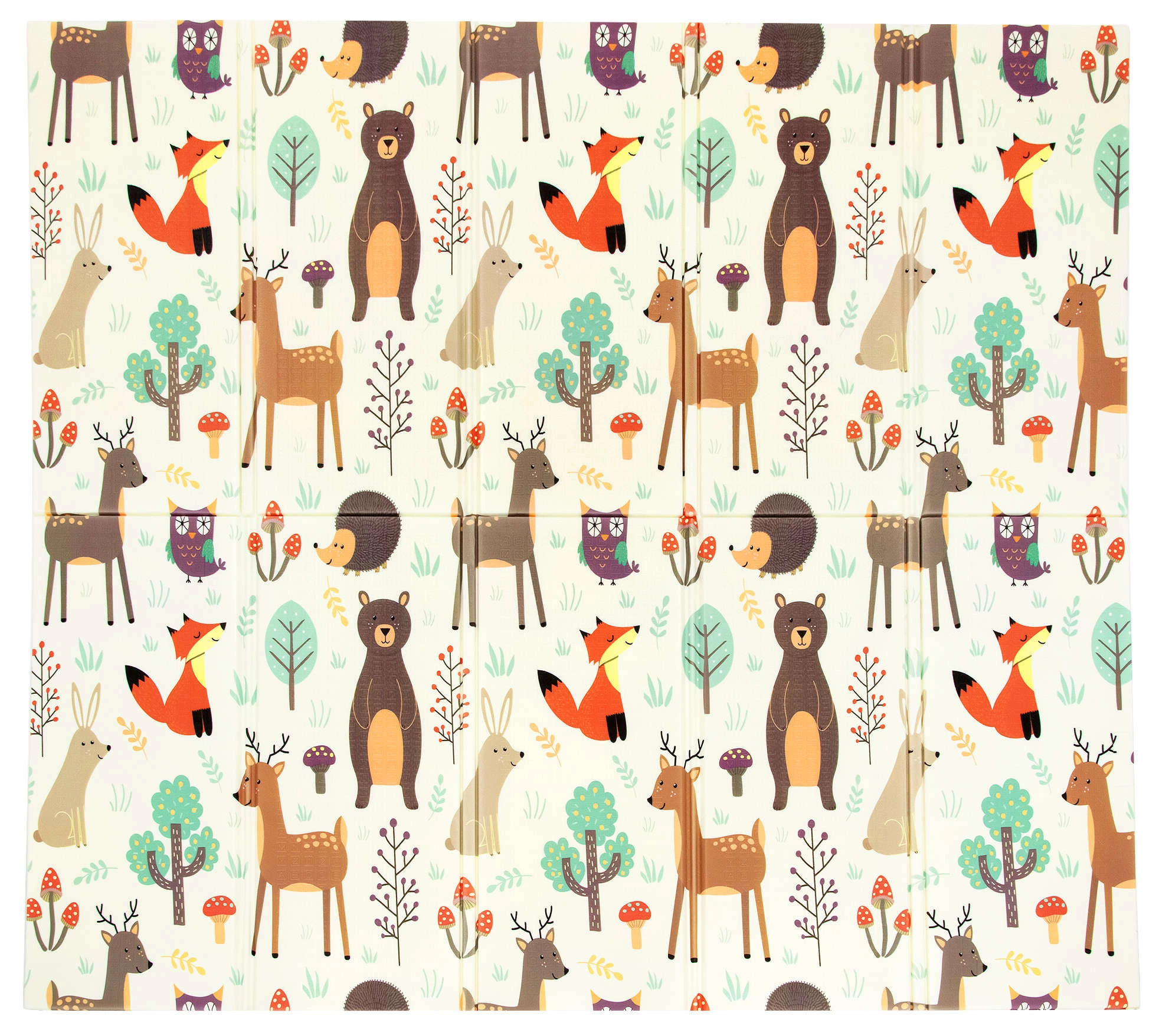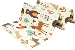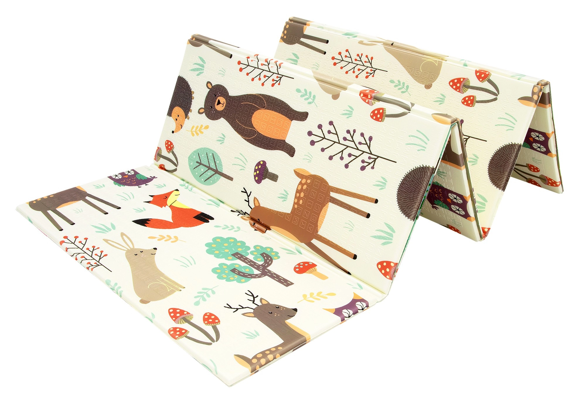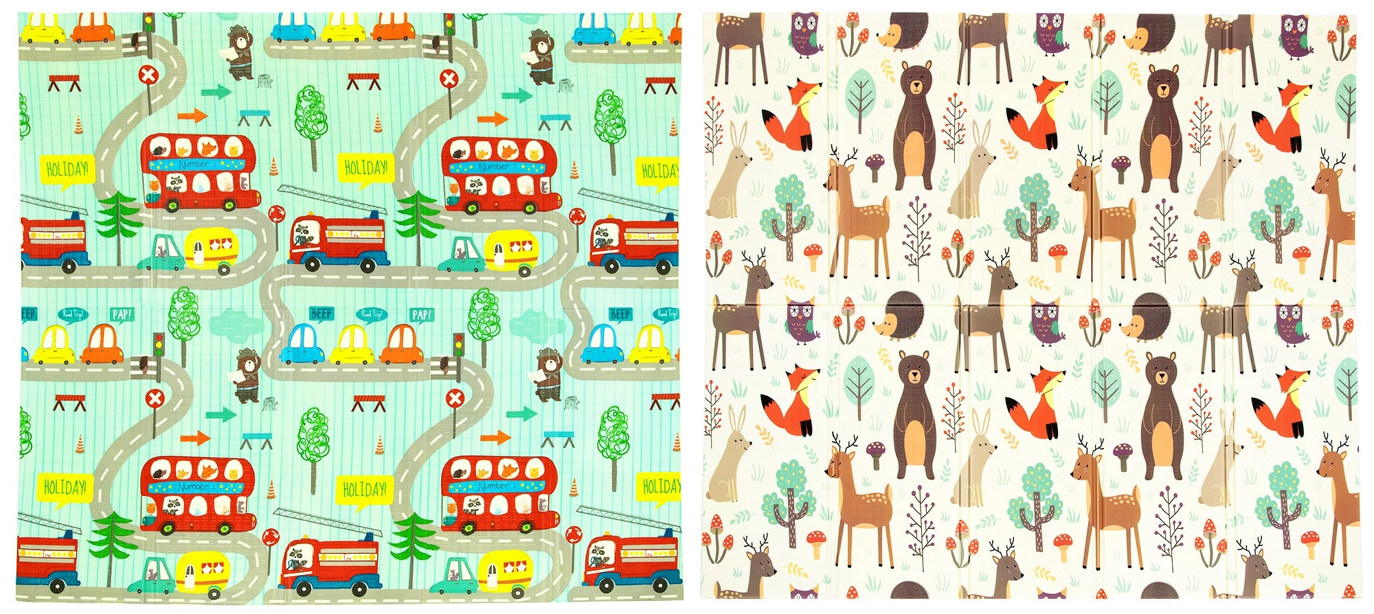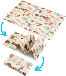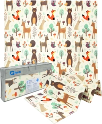 Kilimėlis yra dvipusis: vienoje pusėje – subtilūs miško gyvūnų motyvai, kitoje – linksmos spalvingos gatvelės. Lengvai sulankstomas į kompaktiškus matmenis, lengvas ir dėl užsegamo krepšio su rankenomis patogiai nešamas į svetainę, vaikų kambarį ar į sodą bei pikniką. Atsparų vandeniui paviršių pakanka nuvalyti drėgna šluoste – higieniškas sprendimas, tinkamas ir alergiškiems.