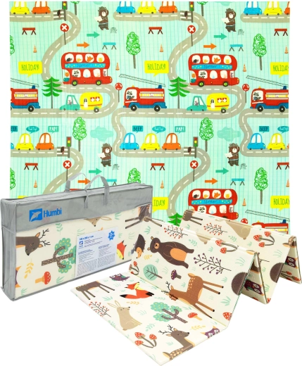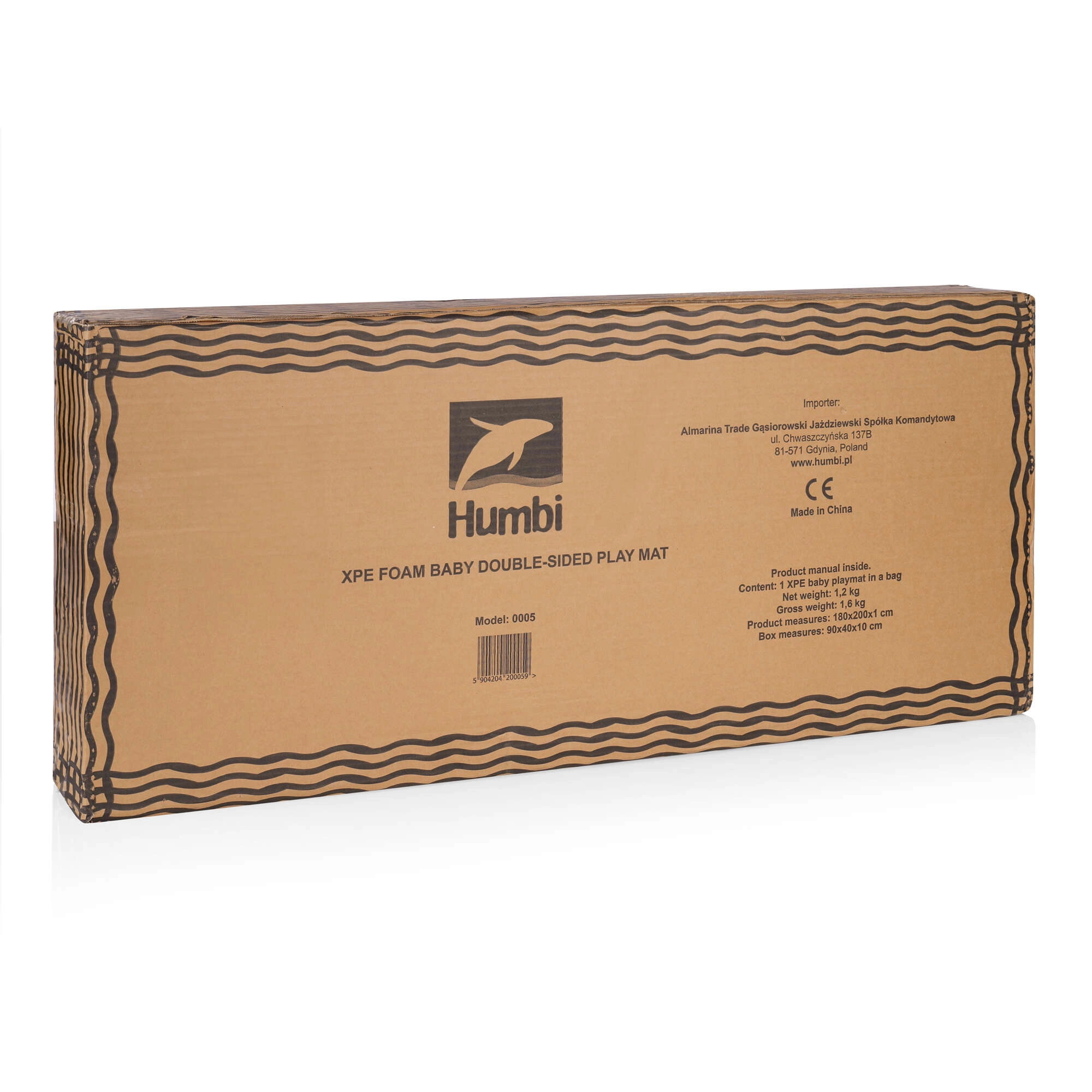 Praktiškas vaikiškas HUMBI kilimėlis iš aukštos kokybės XPE putų, matmenys 200 × 180 × 1 cm, yra dvipusis, sulankstomas ir atsparus vandeniui. Suteikia minkštą amortizaciją, šiluminę izoliaciją nuo šaltų grindų ir turi neslystantį paviršių. Komplekte yra transportavimo krepšys patogiam laikymui ir nešiojimui. Be kenksmingų medžiagų, atitinka EN71 ir REACH.