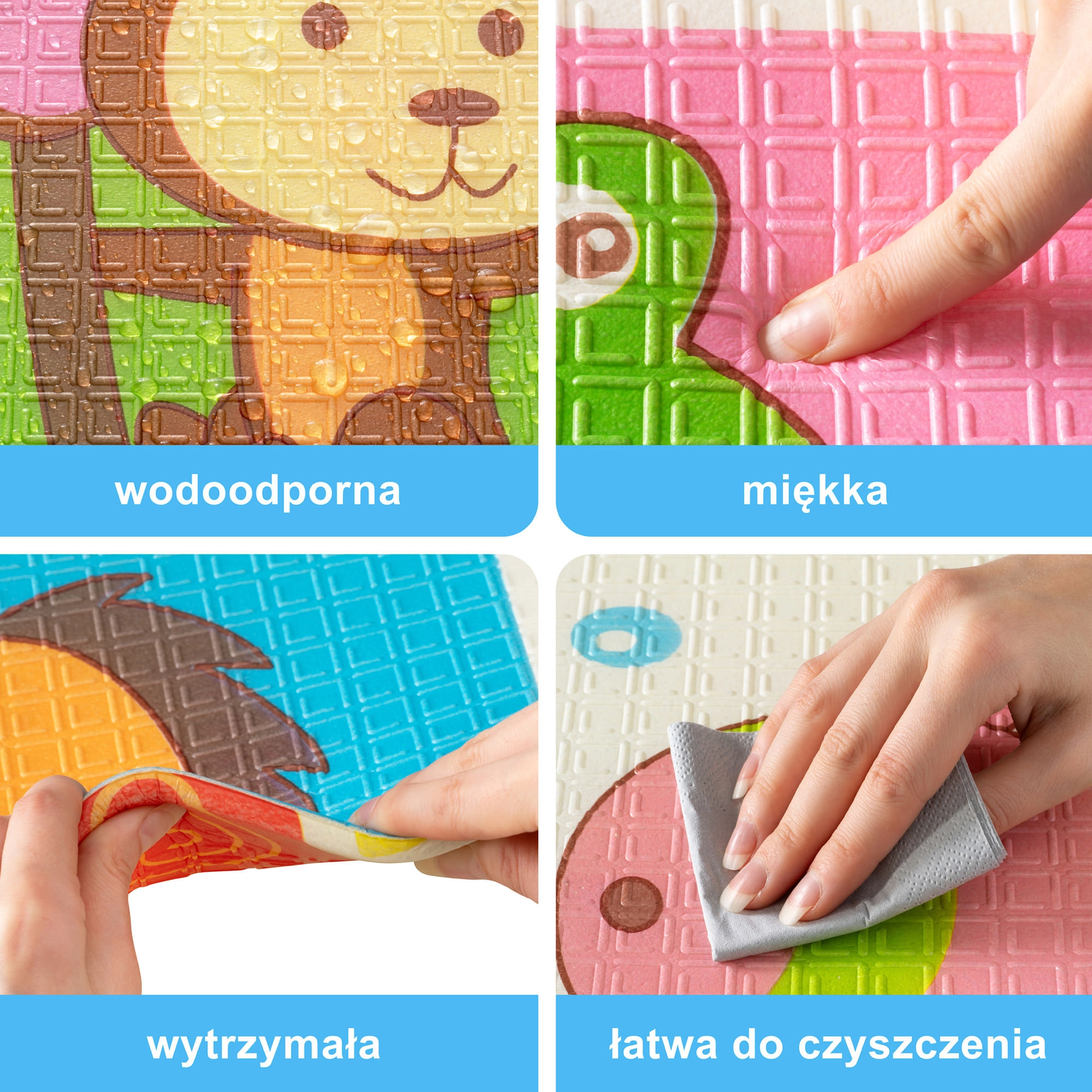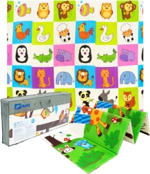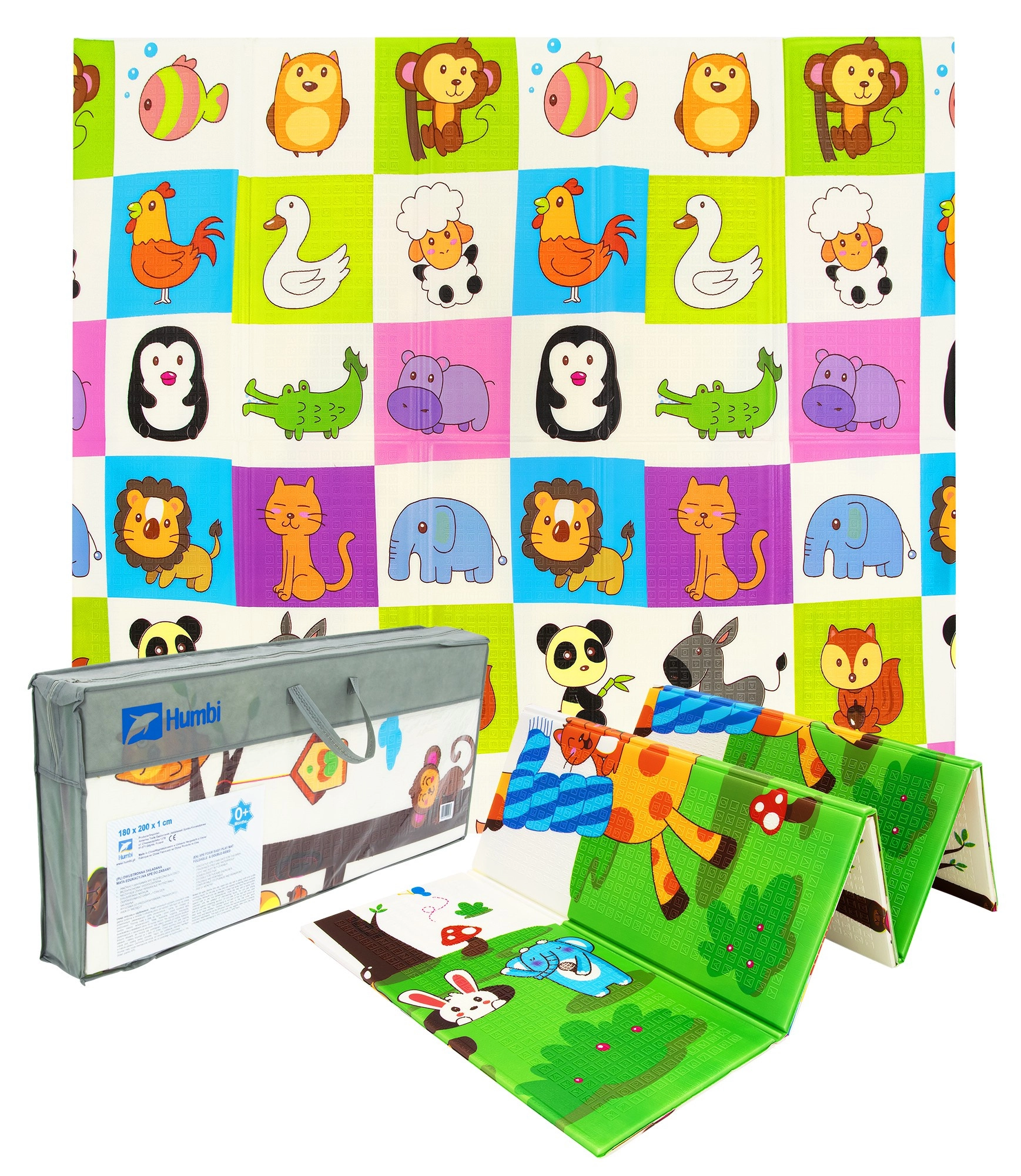 Didelis vaikiškas HUMBI kilimėlis iš aukštos kokybės XPE putų suteikia minkštą, saugų ir atsparų vandeniui pagrindą žaidimams, ropojimui ir pirmiesiems žingsniams. Jis yra dvipusis su linksmomis gyvūnų iliustracijomis, greitai sulankstomas, lengvai valomas, o dėl nešiojamo krepšio su rankena patogu pasiimti tiek namuose, tiek lauke. CE sertifikatas ir atitiktis EN71 bei REACH standartams užtikrina, kad nėra kenksmingų medžiagų.
