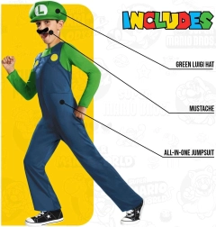 Vaikiškas Super Mario serijos Luigio kostiumas pradžiugins visus mažus šio populiaraus vaizdo žaidimo gerbėjus. Oficialiai licencijuotas Disguise rinkinys puikiai tinka karnavalui, maskaradui ar žaidimams namuose. Jame yra viskas, ko reikia: žaliai mėlynas kombinezonas su geltonais mygtukais, ikoninė kepurė ir lipdomi ūsai. Dydis tinka vaikams 10–12 metų ir ūgiui 137–149 cm.