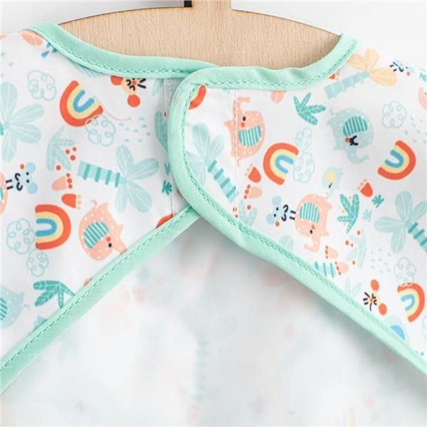Lipdukinis užsegimas leidžia greitai uždėti ir nuimti, o minkšta priekinė kišenė sulaiko trupinius ir lašus. Prijuostė tinka maitinimui, savarankiškam valgymui ir kūrybinei veiklai. Šiuolaikiniai raštai ir žalia spalva patiks tiek vaikams, tiek tėvams.