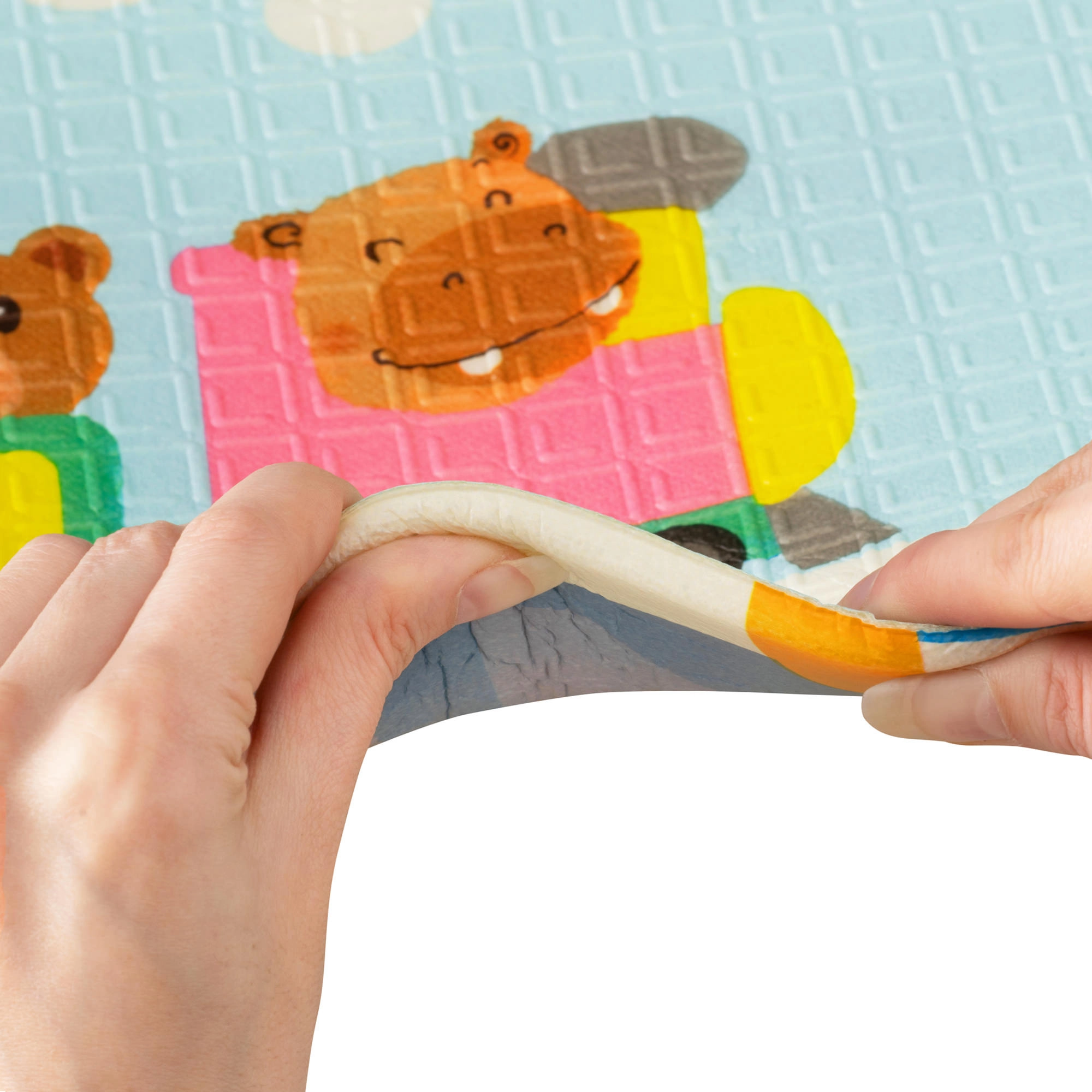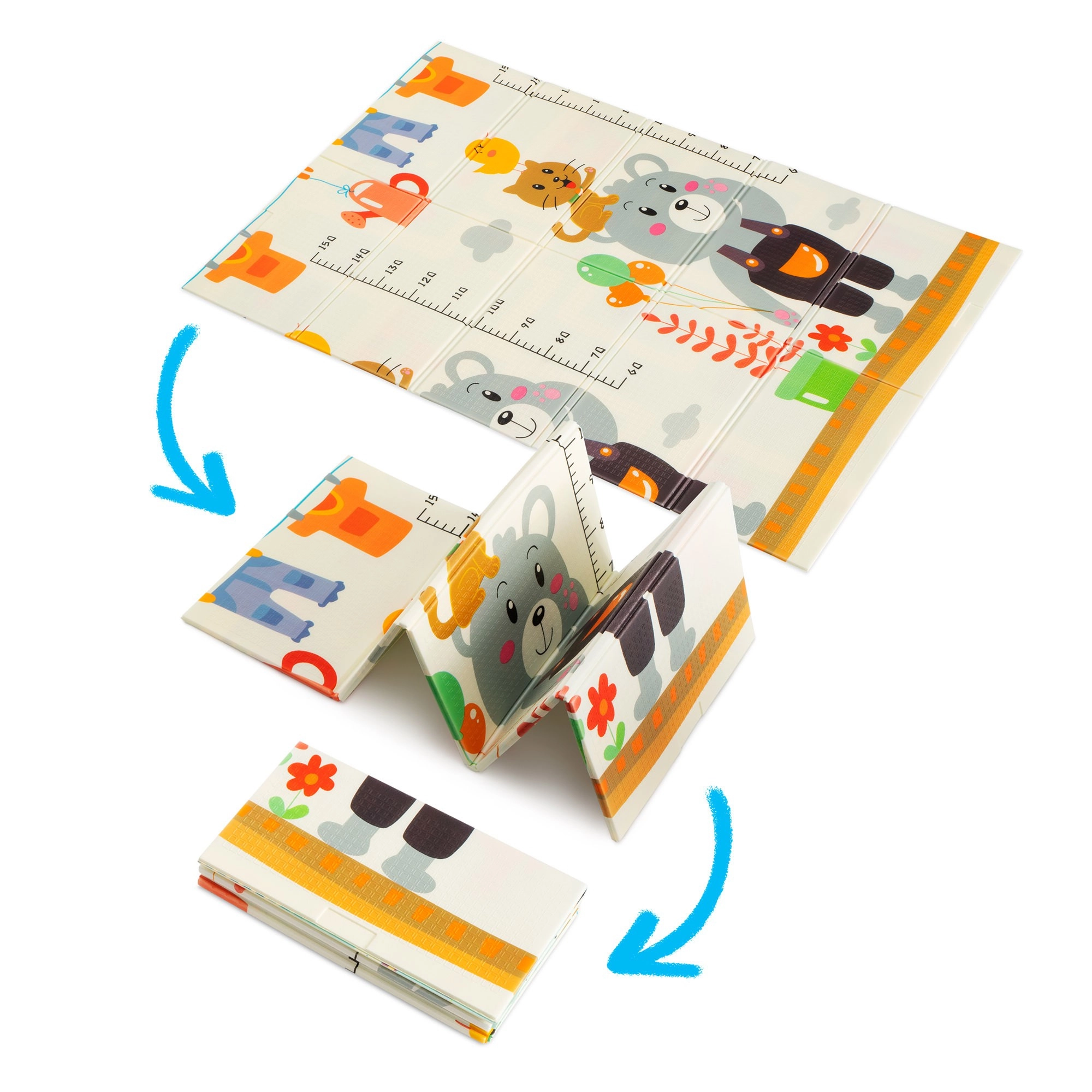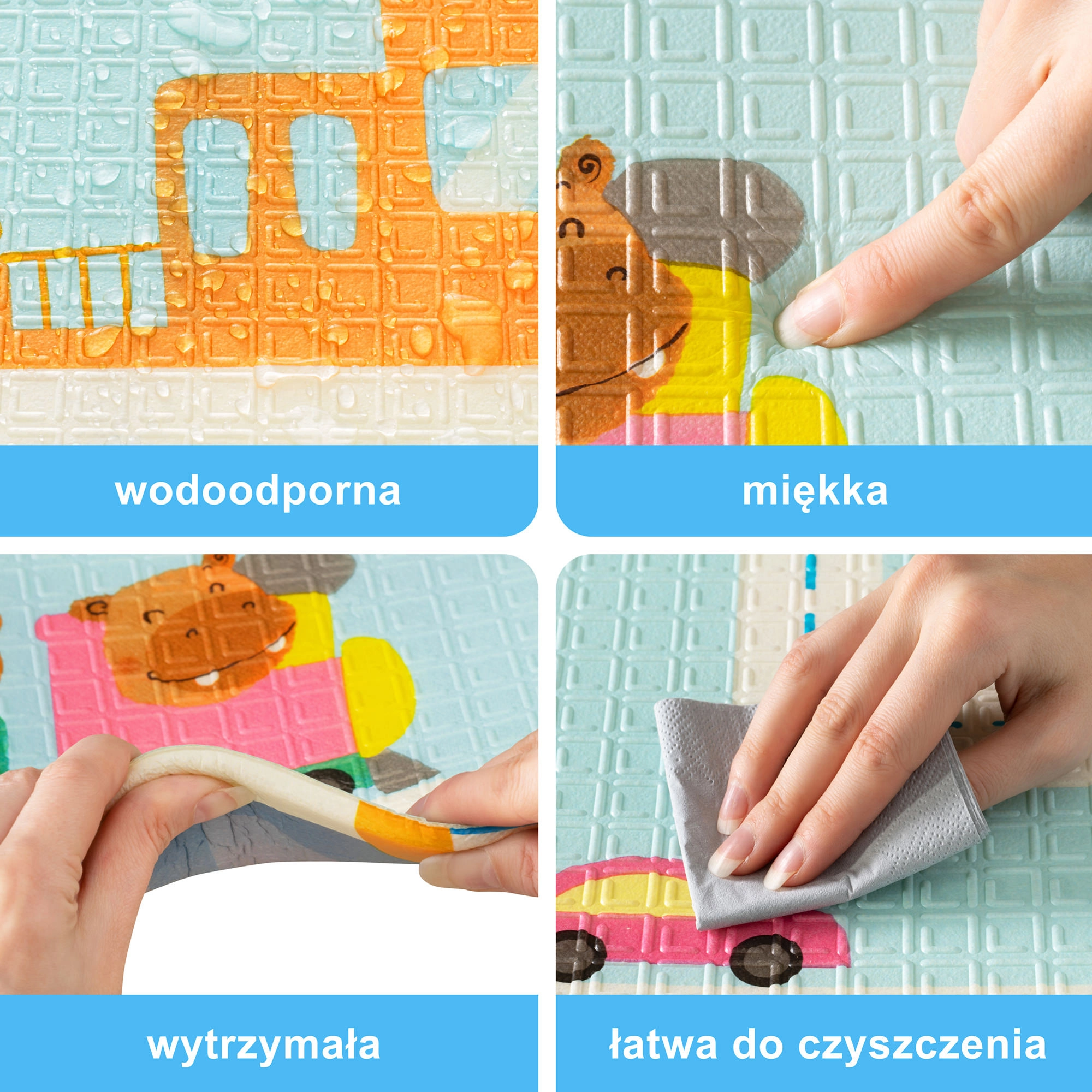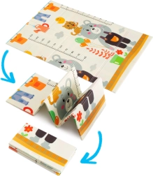 Dvipusis dizainas siūlo du edukacinius motyvus: linksmus gyvūnėlius su ūgio matuokliu augimui sekti ir spalvingus kelius su pastatais ir transporto priemonėmis vaizduotei lavinti. Kilimėlį paprastai sulankstysite per kelias sekundes, lengvai paslėpsite, o su pridedamu užsegamu krepšiu pasiimsite bet kur – į svetainę, vaikų kambarį, balkoną, sodą ar kelionėse.