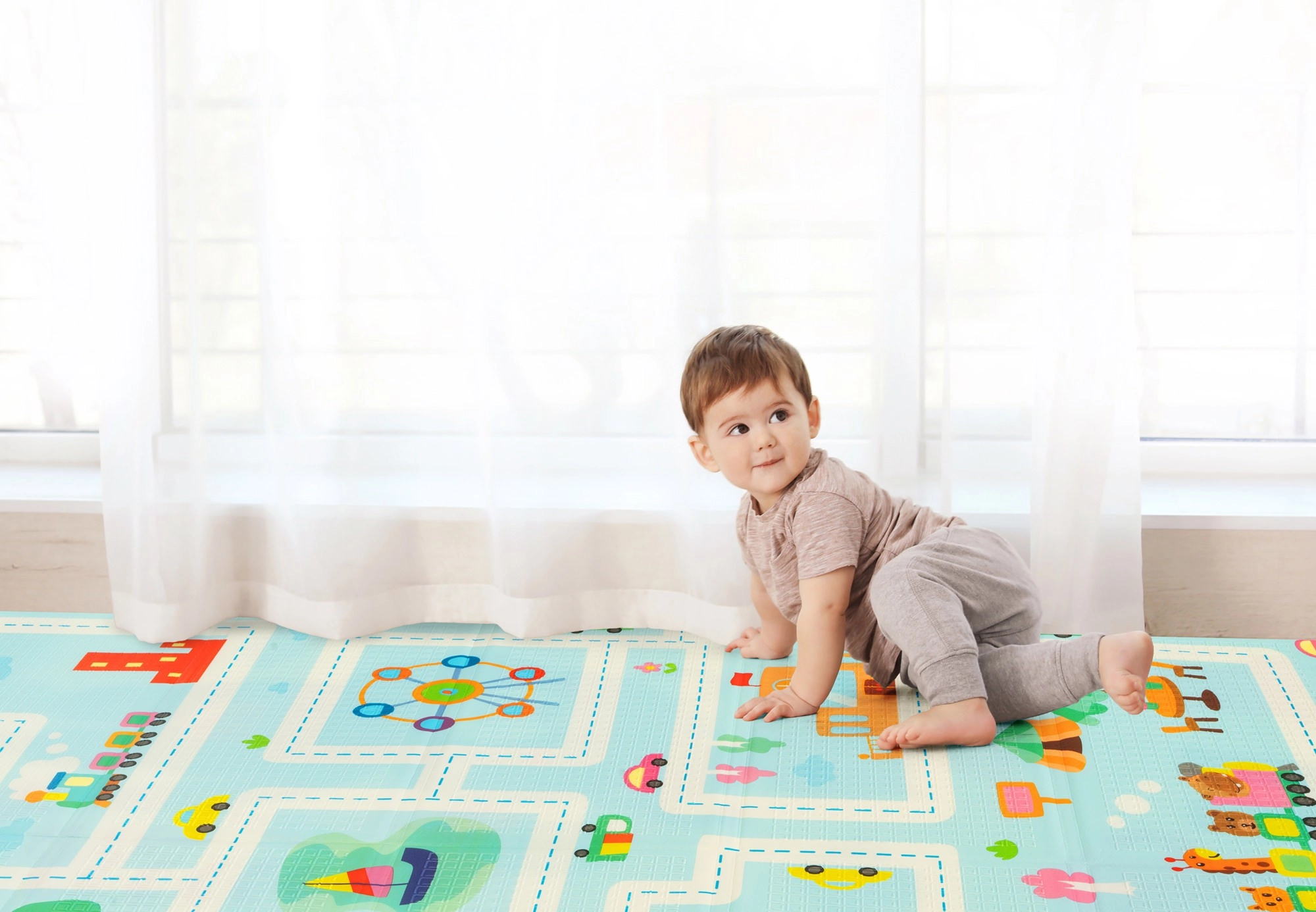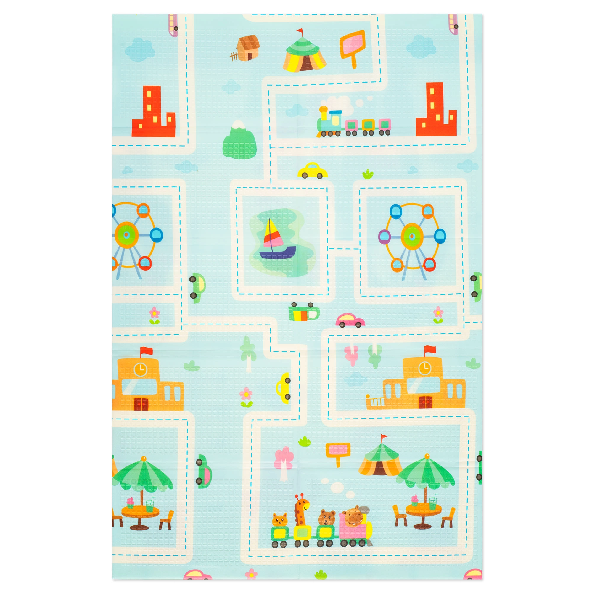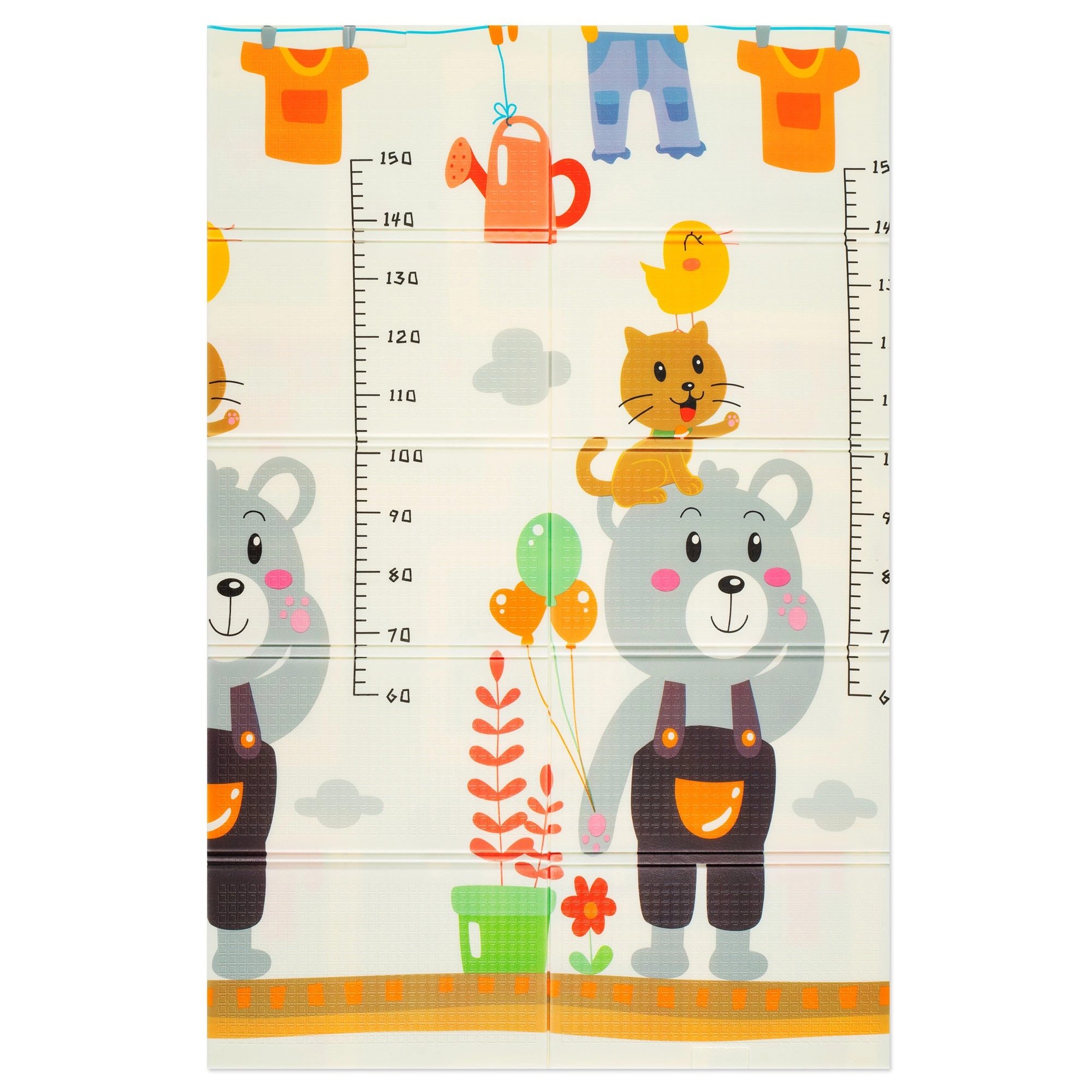 Dvipusis dizainas siūlo du edukacinius motyvus: linksmus gyvūnėlius su ūgio matuokliu augimui sekti ir spalvingus kelius su pastatais ir transporto priemonėmis vaizduotei lavinti. Kilimėlį paprastai sulankstysite per kelias sekundes, lengvai paslėpsite, o su pridedamu užsegamu krepšiu pasiimsite bet kur – į svetainę, vaikų kambarį, balkoną, sodą ar kelionėse.