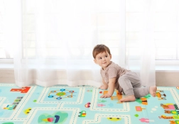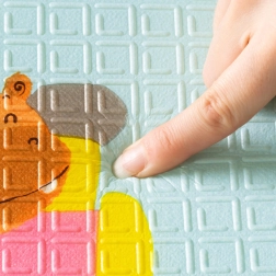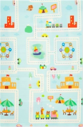 Viena pusė siūlo linksmus gyvūnėlių motyvus su ūgio matuokliu, kita – spalvotus kelius ir pastatus, skatinančius vaiko fantaziją ir pojūčių lavinimą.
