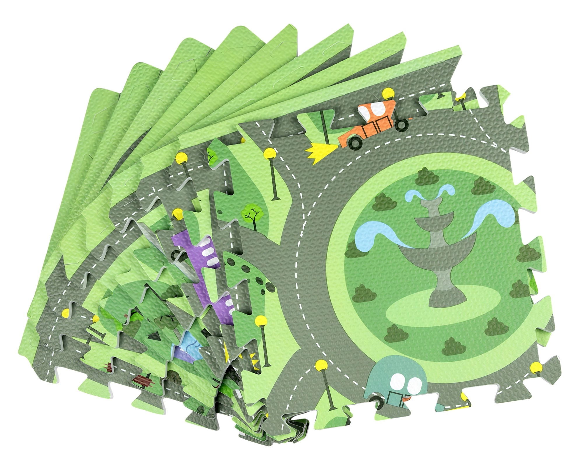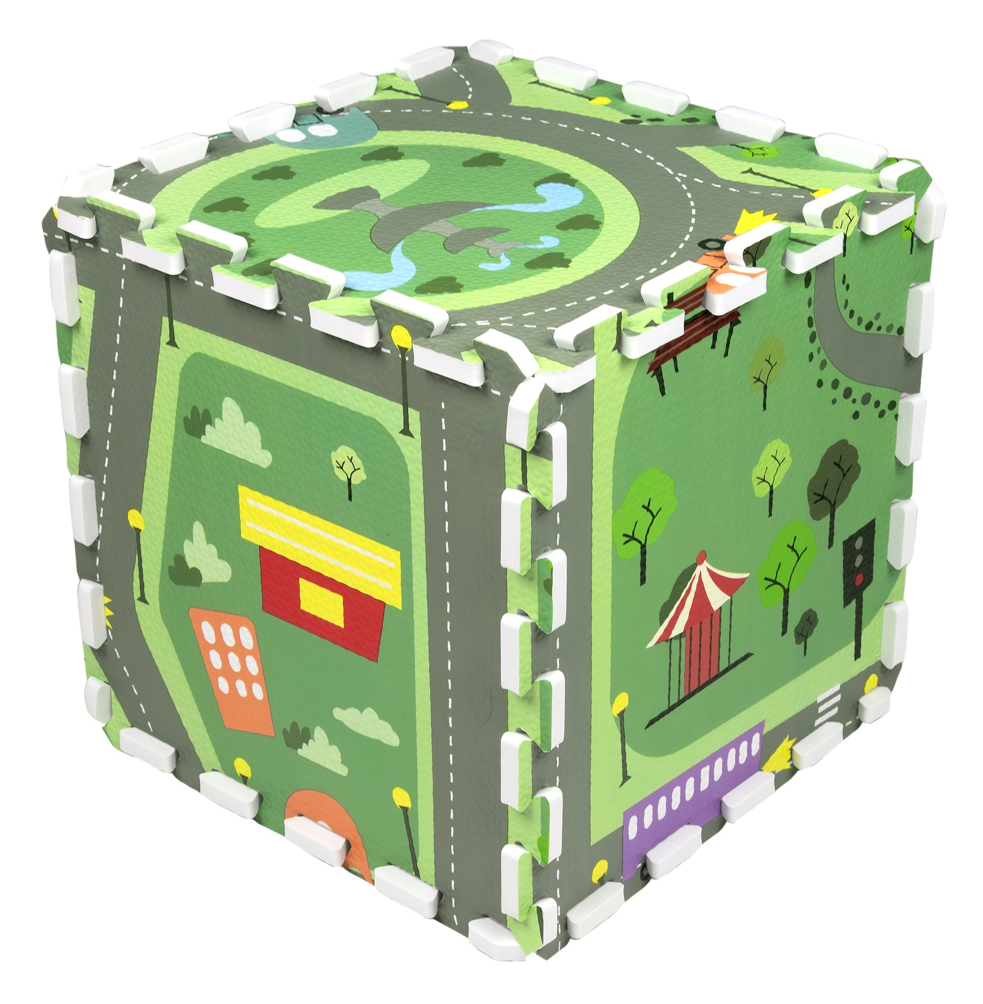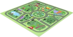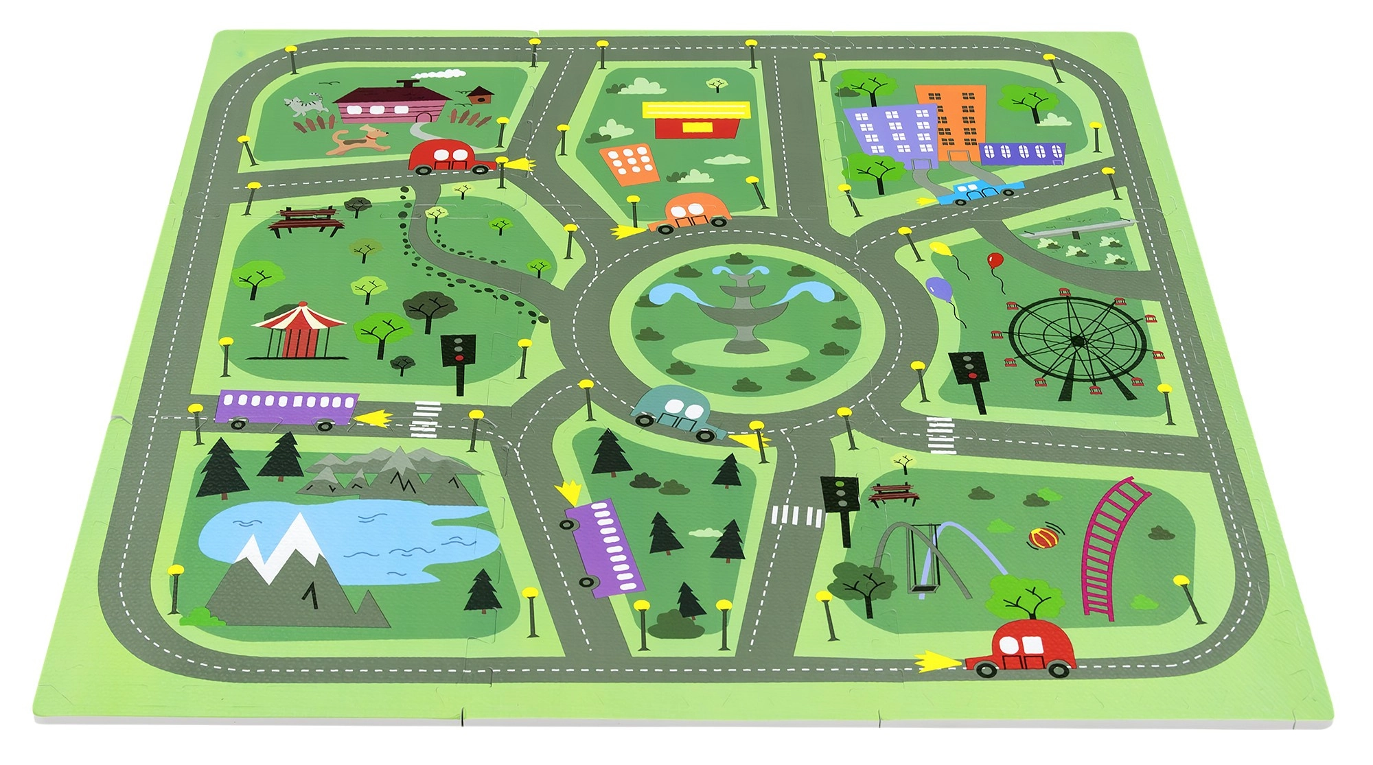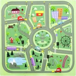 Keliai, žiedinė sankryža, parkai, ežerėlis, pastatai ir eismo elementai skatina vaizduotę ir eismo taisyklių pažinimą. Idealu mašinėlėms ir figūrėlėms.