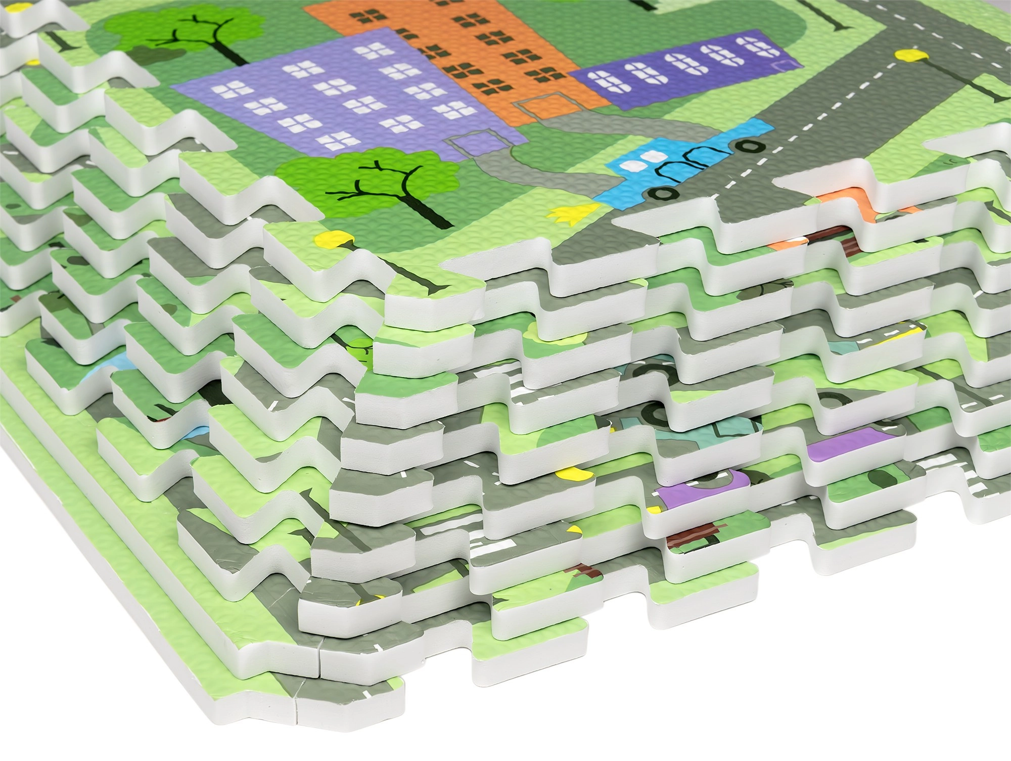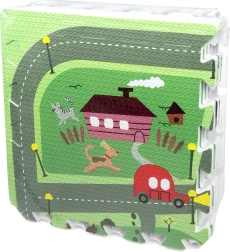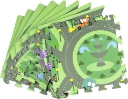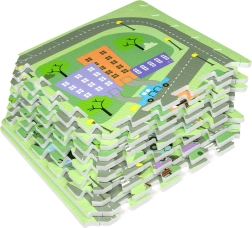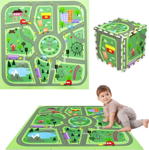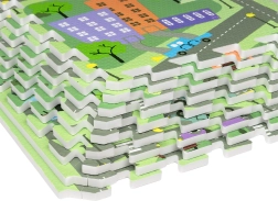 Sukurkite vaikui patogią ir higienišką žaidimų vietą. Kilimėlis iš elastingos EVA putos yra be ftalatų, formamido, PVC ir BPA, turi neslystantį paviršių ir švelnius reljefus saugesniems pirmiesiems žingsniams. Pastelinis miesto gatvių motyvas su žiedine sankryža, parkais, ežerėliu ir pastatais žadina fantaziją ir kviečia važinėti mašinėlėmis bei kurti kūrybiškus žaidimus su figūrėlėmis.