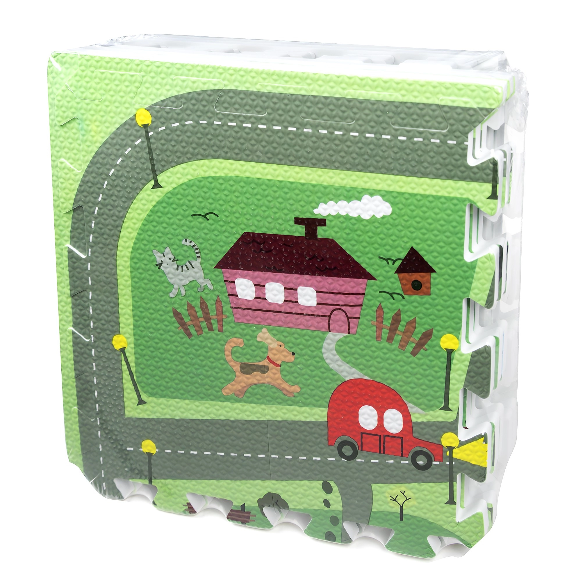 9 dalis, kurių dydis 30 × 30 × 1 cm, lengvai sujungsite į 90 × 90 cm plotą, kraštinės juostos užtikrins tvarkingą kraštą. Dalis galima jungti to paties modelio ribose ir taip pat statyti 3D formas (pvz., kubą). Kilimėlis puikiai izoliuoja šaltį nuo kietų grindų (parketas, plytelės, laminatas) ir sugeria smūgius.