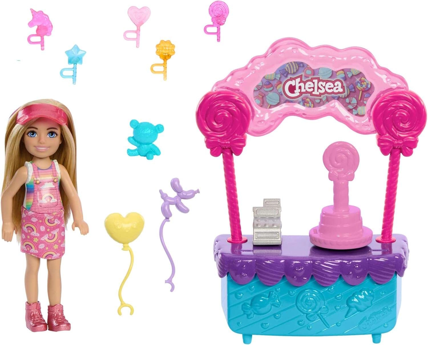 Atraskite saldų pasaulį su lėlyte Chelsea iš Barbie serijos – spalvingas saldainių stendas suteikia daug kūrybiško vaidmenų žaidimo pramogų. Rinkinyje yra apie 15 cm aukščio lėlytė rožinėje suknelėje su vaivorykšte, stendas su kasa, besisukanti torto padėklo bazė, saldainių dekoracijos ir smulkūs priedai saldumynų pardavimui ir patiekimui. Puiki dovana vaikams nuo 3 metų.