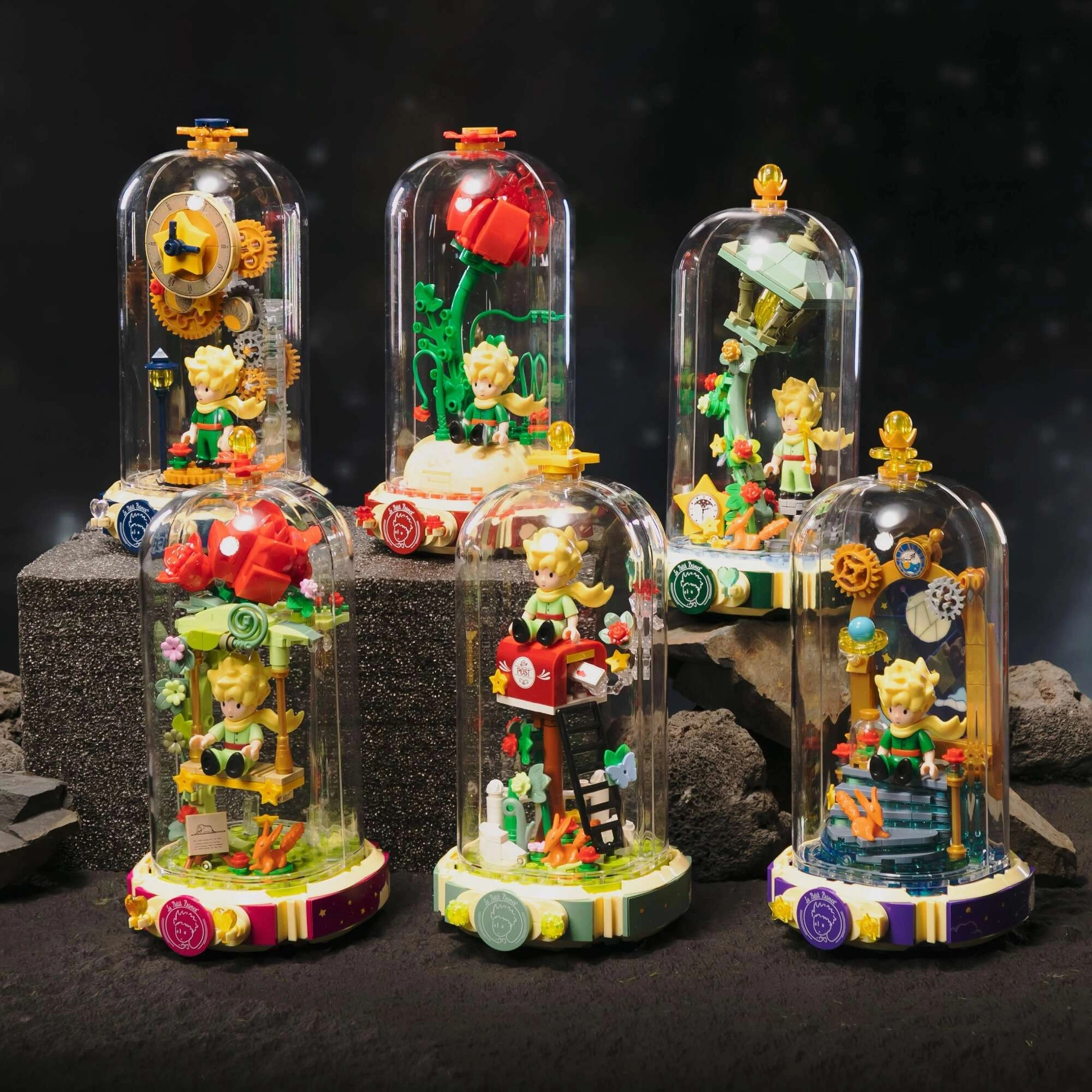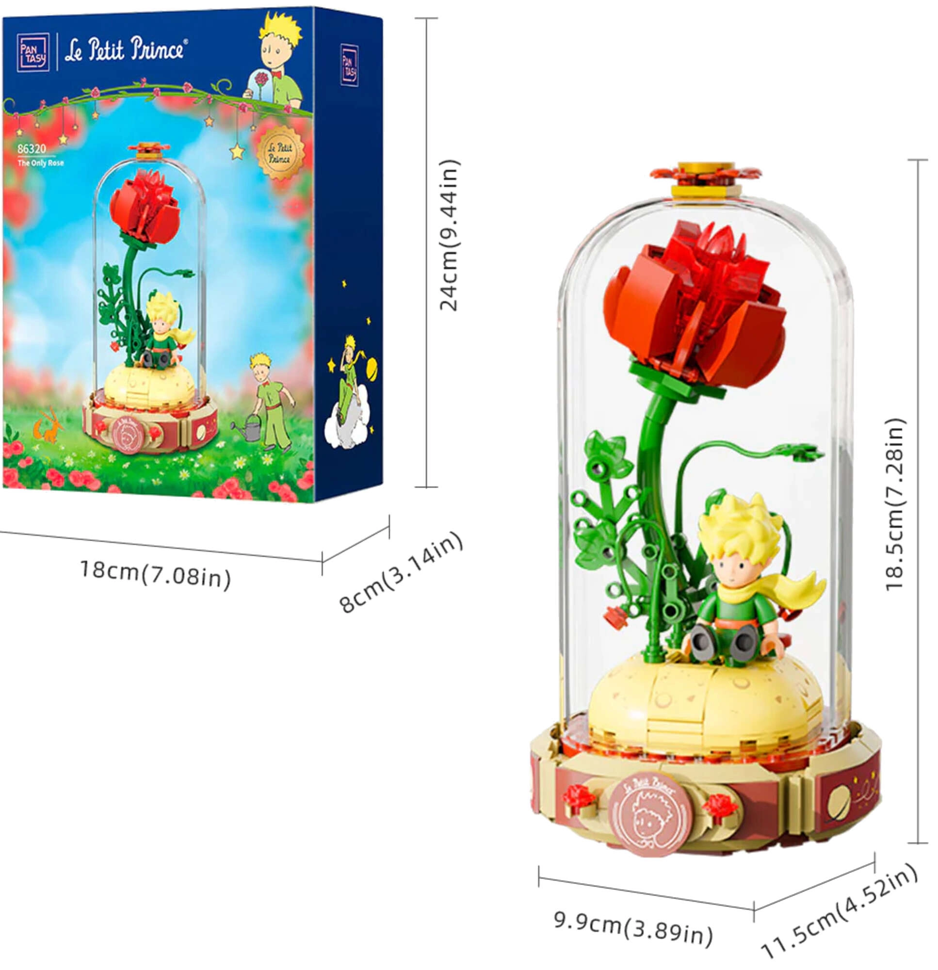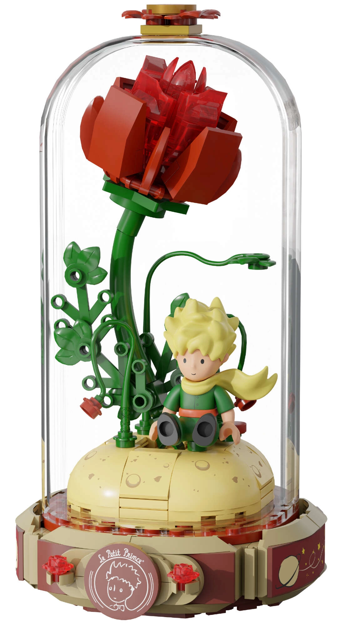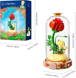Pastatykite simbolinę raudoną rožę ant pjedestalo atviros knygos formos su užrašu „Le Petit Prince“. Šalia stovi Mažasis princas ir lapė būdingoje poza. Išpuoselėtos stiebų, lapų ir žiedų detalės suteikia modeliui harmonijos ir elegancijos – puikus kūrinys ekspozicijai ir kūrybiškam laisvalaikiui.