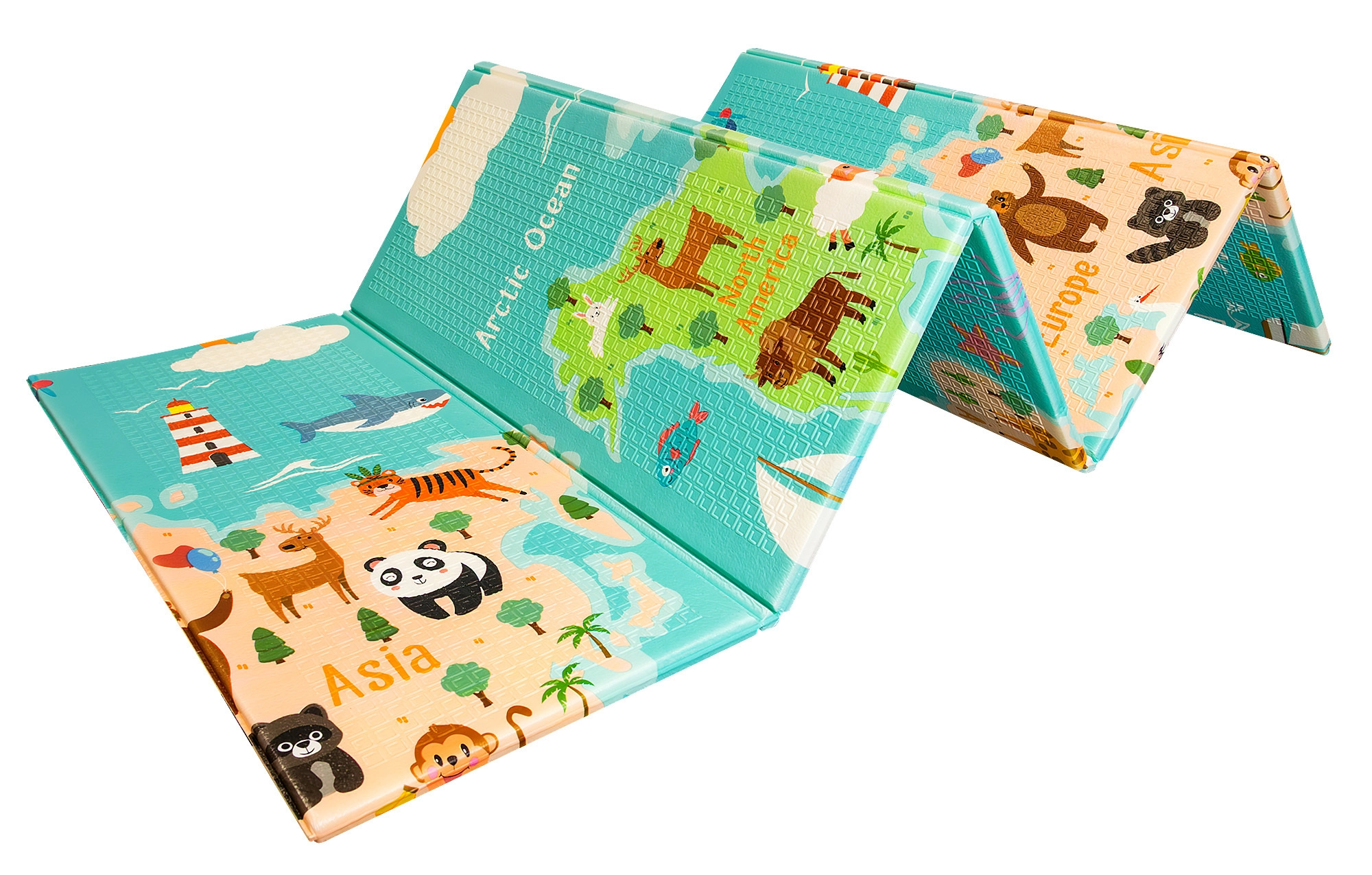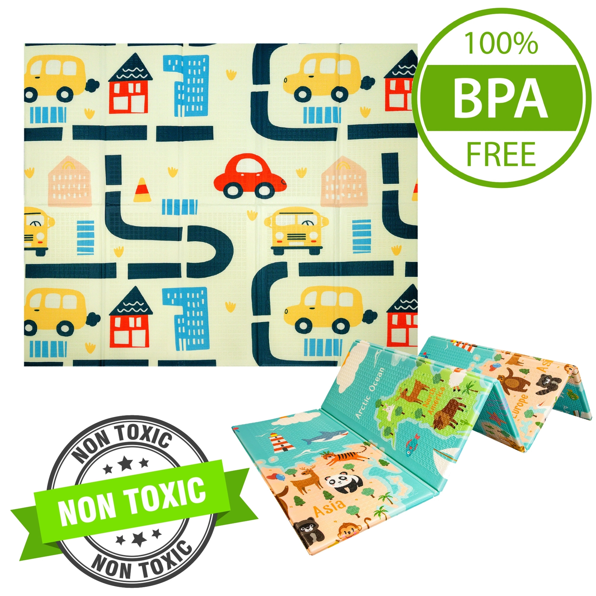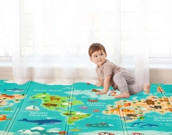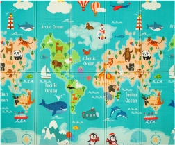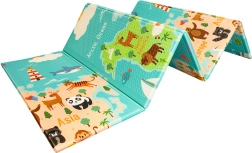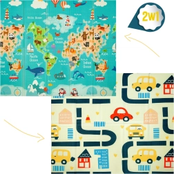 Viena pusė su spalvotu pasaulio žemėlapiu ir gyvūnais, kita – su miestu ir keliais mašinėlėms. Dvi edukacinės temos viename kilimėlyje ugdo vaizduotę ir žinias.
