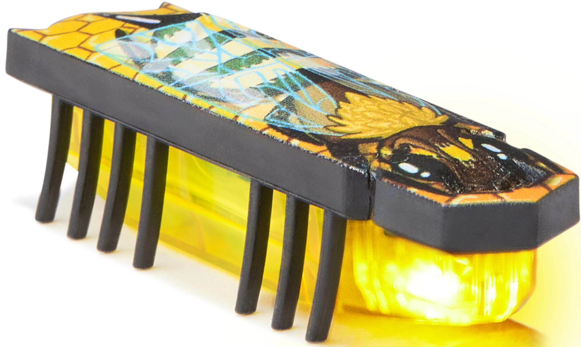 Mikrorobotas su permatomu geltonu korpusu šviečia, o dėl vibracijų žvaliai „bėgioja“ trasa ir lygiu paviršiumi. Linksmi šviesos efektai kviečia žaisti.