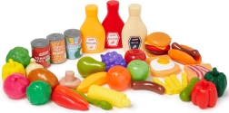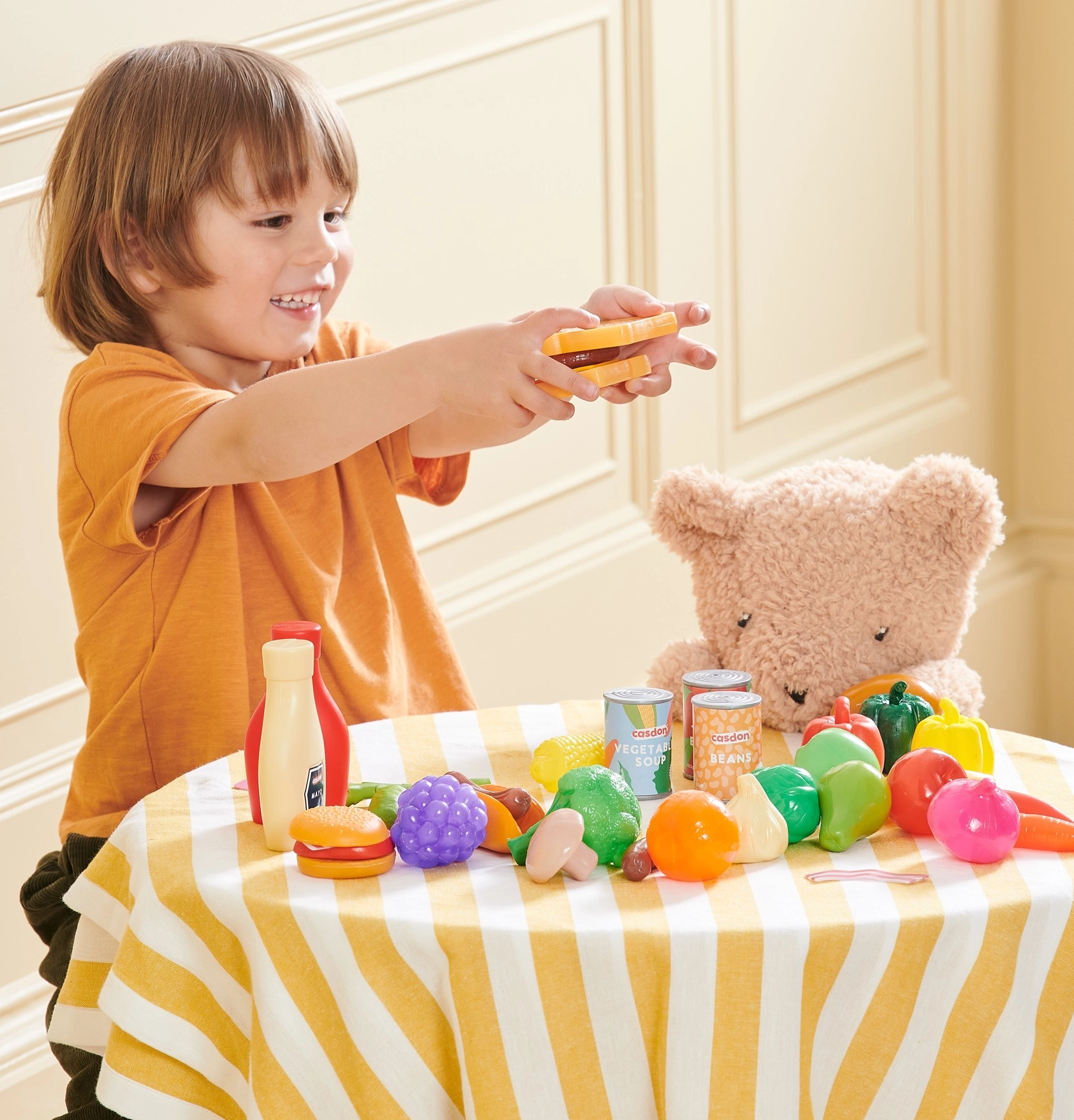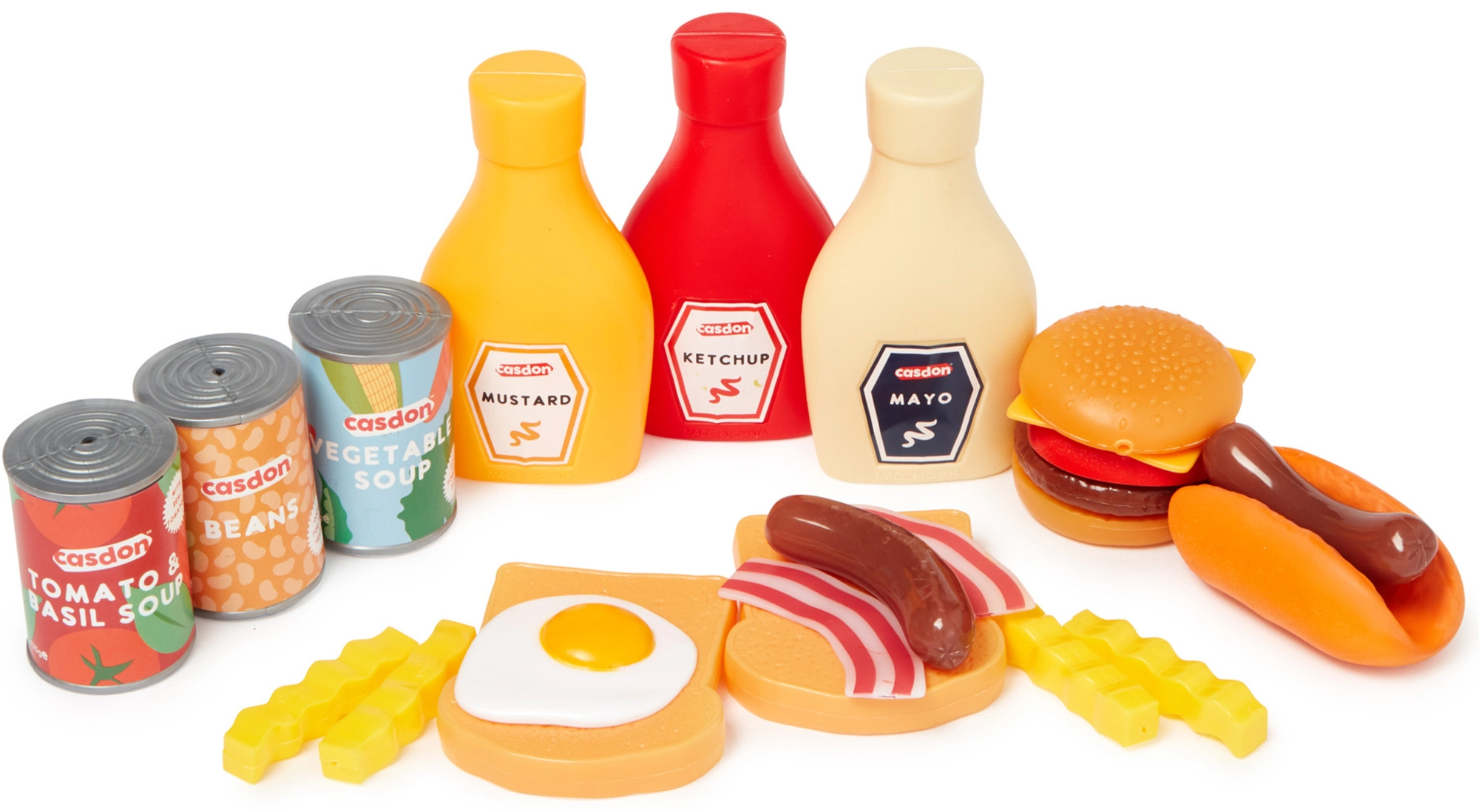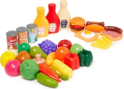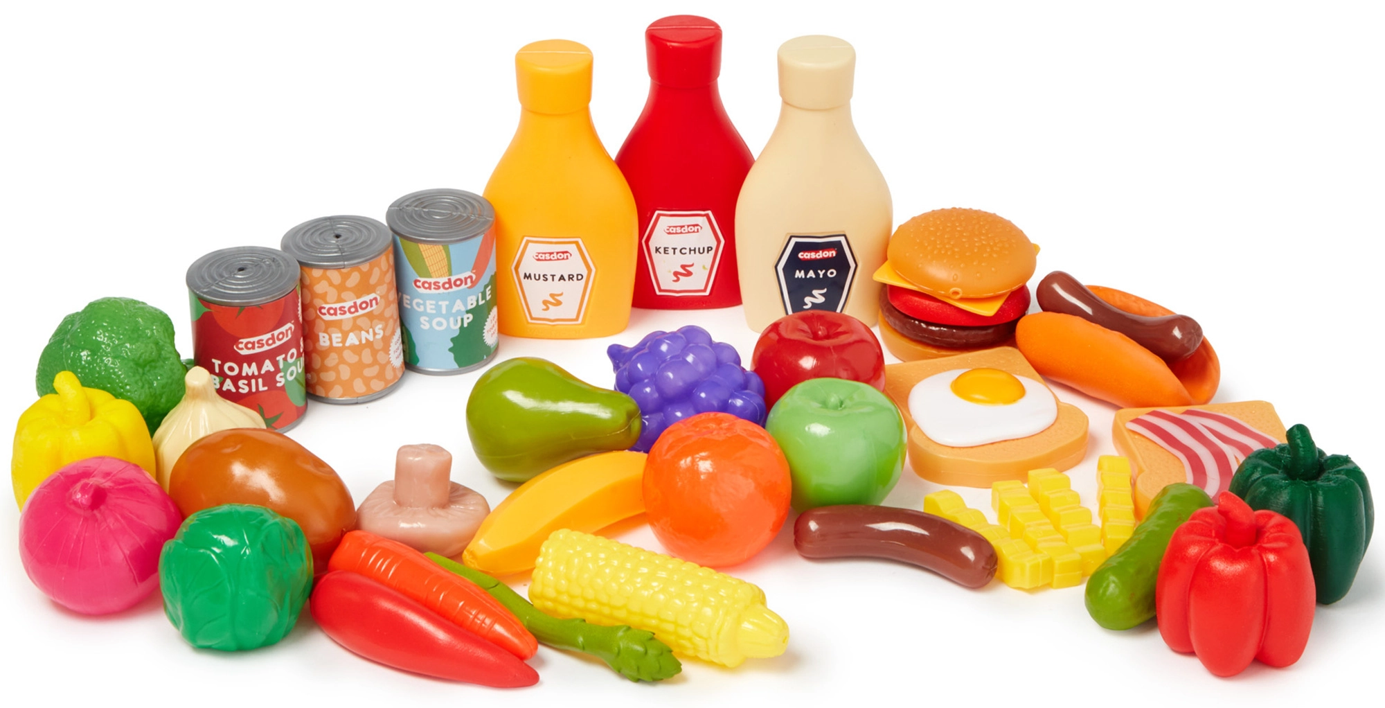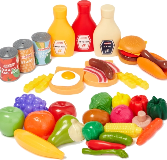 Šis turtingas CASDON vaikų maisto produktų rinkinys suteiks viską, ko reikia realistiškam gaminimo ir apsipirkimo žaidimui. Jame rasite plastikinius vaisius ir daržoves (bananas, obuolys, agurkas, vynuogės, svogūnas, paprika, pomidoras, brokolis), supakuotų gaminių imitacijas (konservai, kečupas, garstyčios, majonezas) ir mėgstamus skanėstus, tokius kaip mėsainis, dešrainis, bulvytės fri ar skrebučiai su kiaušiniu ir šonine.