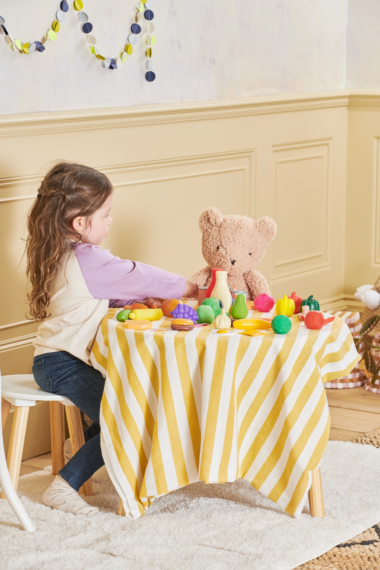 Dėl lengvų ir patvarių dalių rinkinys tinka mažoms vaikų rankoms. Puikiai papildo vaikų virtuvėlę ar parduotuvėlę ir natūraliai lavina komunikaciją, vaizduotę ir bendradarbiavimą žaidžiant.