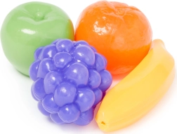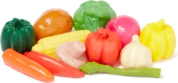 Plastikiniai vaisiai ir daržovės, papildyti miniatiūrinėmis dėžutėmis ir konservais, atrodo kaip tikri. Vaikai lengvai atpažins bananą, vynuoges, kukurūzus, papriką ar pievagrybį ir išmoks įprastų produktų pavadinimus.