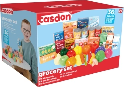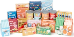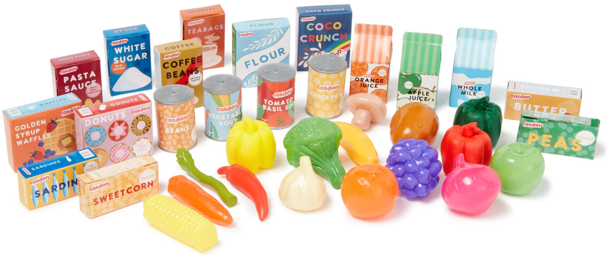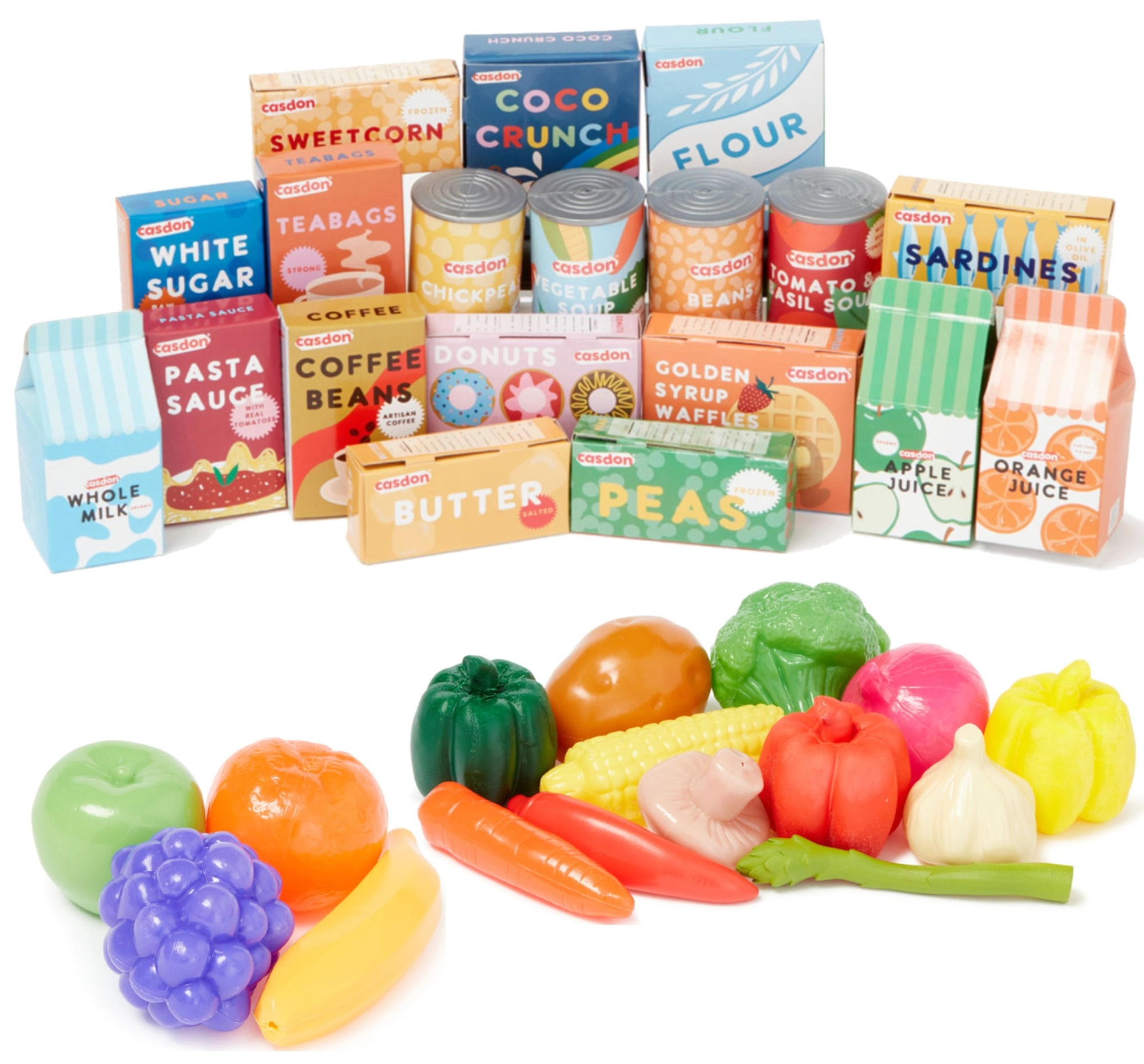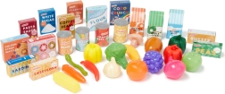 Su šiuo gausiai aprūpintu rinkiniu vaikai mėgausis valandomis vaizduotės žaidimų. Čia rasite plastikinius vaisius ir daržoves (pvz., bananą, vynuoges, kukurūzus, papriką, svogūną, česnaką ar pievagrybį) bei mini pakuotes įprastų maisto produktų (miltai, cukrus, kava, pienas, žirneliai, pupelės, sardinės), taip pat gėrimus ir sriubas. Realistiškos formos, spalvos ir spauda skatina mokymąsi per žaidimą.