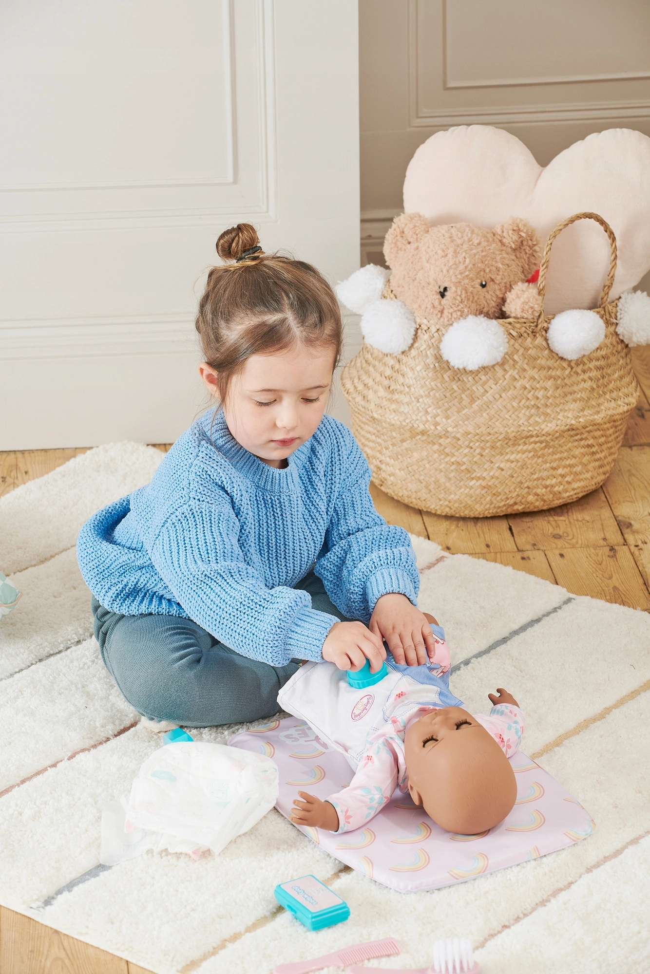 Šis pervystymo rinkinys lėlėms – puikus pasirinkimas mažiesiems prižiūrėtojams. Vaikai gali išbandyti visą priežiūros ritualą – nuo pervystymo iki šukavimo ir „priemonėmis“ atliekamos kūdikio priežiūros. Realistiški priedai ir minkštas kilimėlis suteikia patogų ir kūrybišką žaidimą, kuris lavina smulkiąją motoriką ir empatiją.