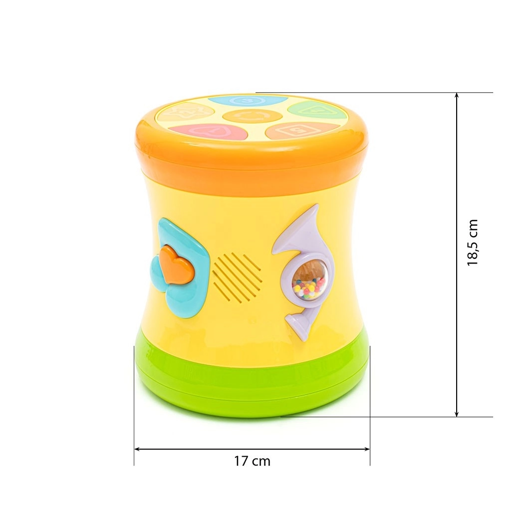 Interaktyvus dvipusis būgnelis BABY MIX geltonos spalvos pradžiugins vaikus nuo 10 mėn. Siūlo 8 melodijas, 12 linksmų dainelių, šviesos efektus ir būgno garsus, kurie lavina klausą, regą, smulkiąją motoriką ir rankų–akių koordinaciją. Puikus derinys – pramoga ir mokymasis viename.