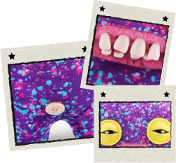 Violetinis paviršius su mėlynai rožinėmis dėmėmis ir ikoniniai dantys daro kiekvieną FUGGLER unikaliu kūriniu, kuris iškart patraukia dėmesį.