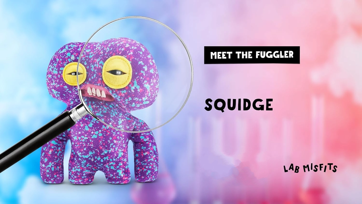 Pliušinis žaislas FUGGLER Squidge iš Spin Master išsiskiria savo neįprasta išvaizda. Violetinį kūną puošia kontrastinės dėmės mėlynos ir rožinės spalvos tonais, kuriančios menišką, net abstraktų efektą. Akį traukiantis komiškai šiurpus dantynas suteikia žaislui savito žavesio ir humoro.