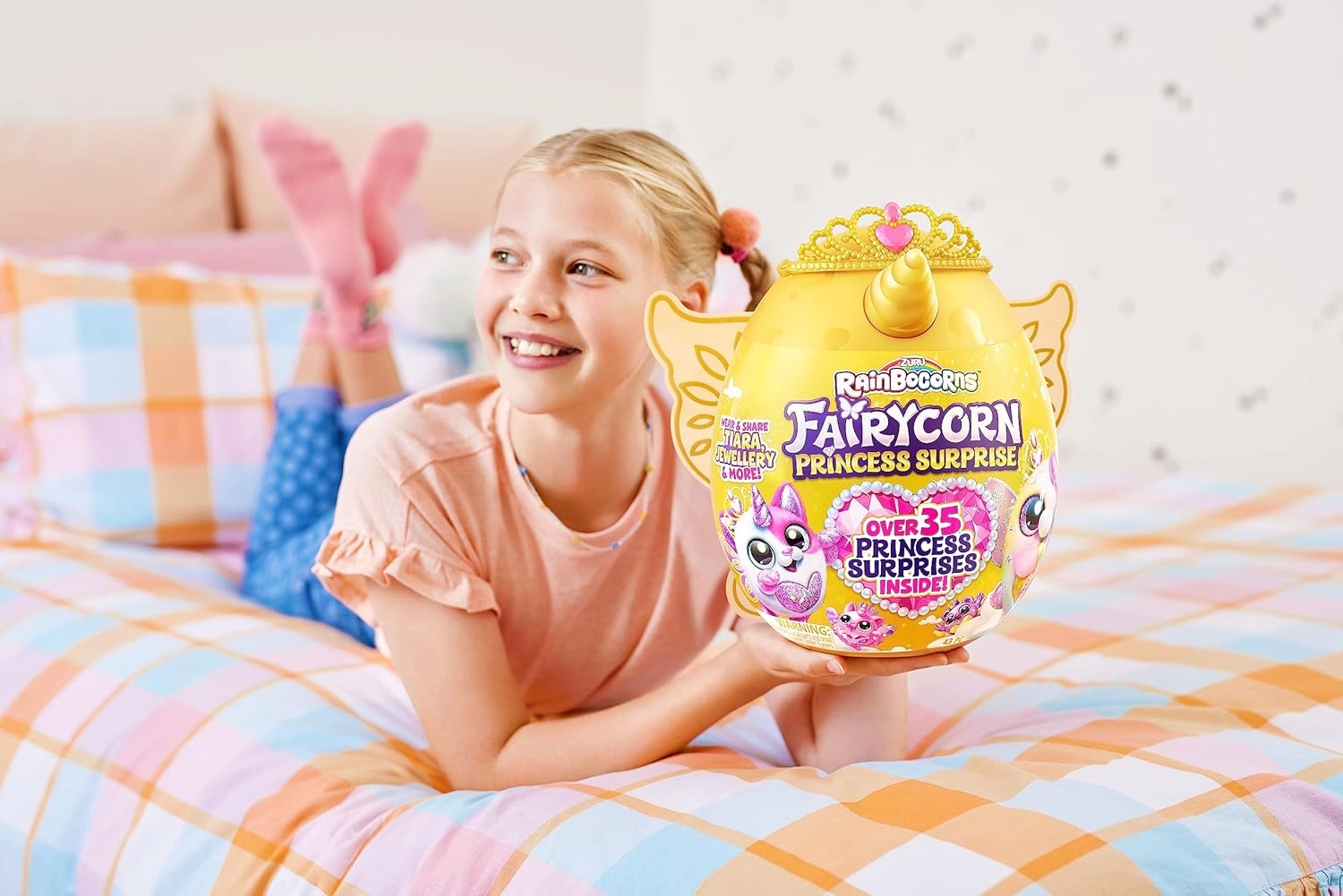 Su Fairycorn Princess Surprise kiekvienas auksinio kiaušinio atidarymas virsta pasakiška akimirka. Viduje jūsų laukia pliušinė princesė‑vienaragė su blizgančiomis detalėmis, širdute ir gausybe aksesuarų, kurie skatins kūrybišką žaidimą ir bendras akimirkas. Kiekvienas rinkinys atneša vis kitokį personažų ir aksesuarų derinį – surinkite juos visus!