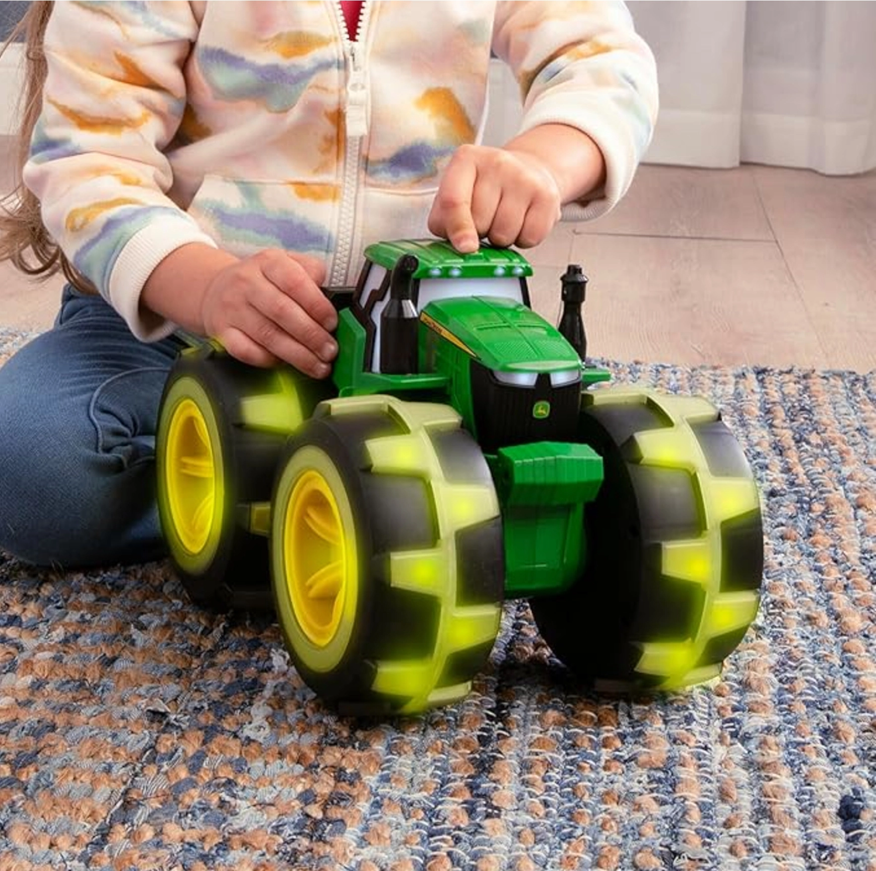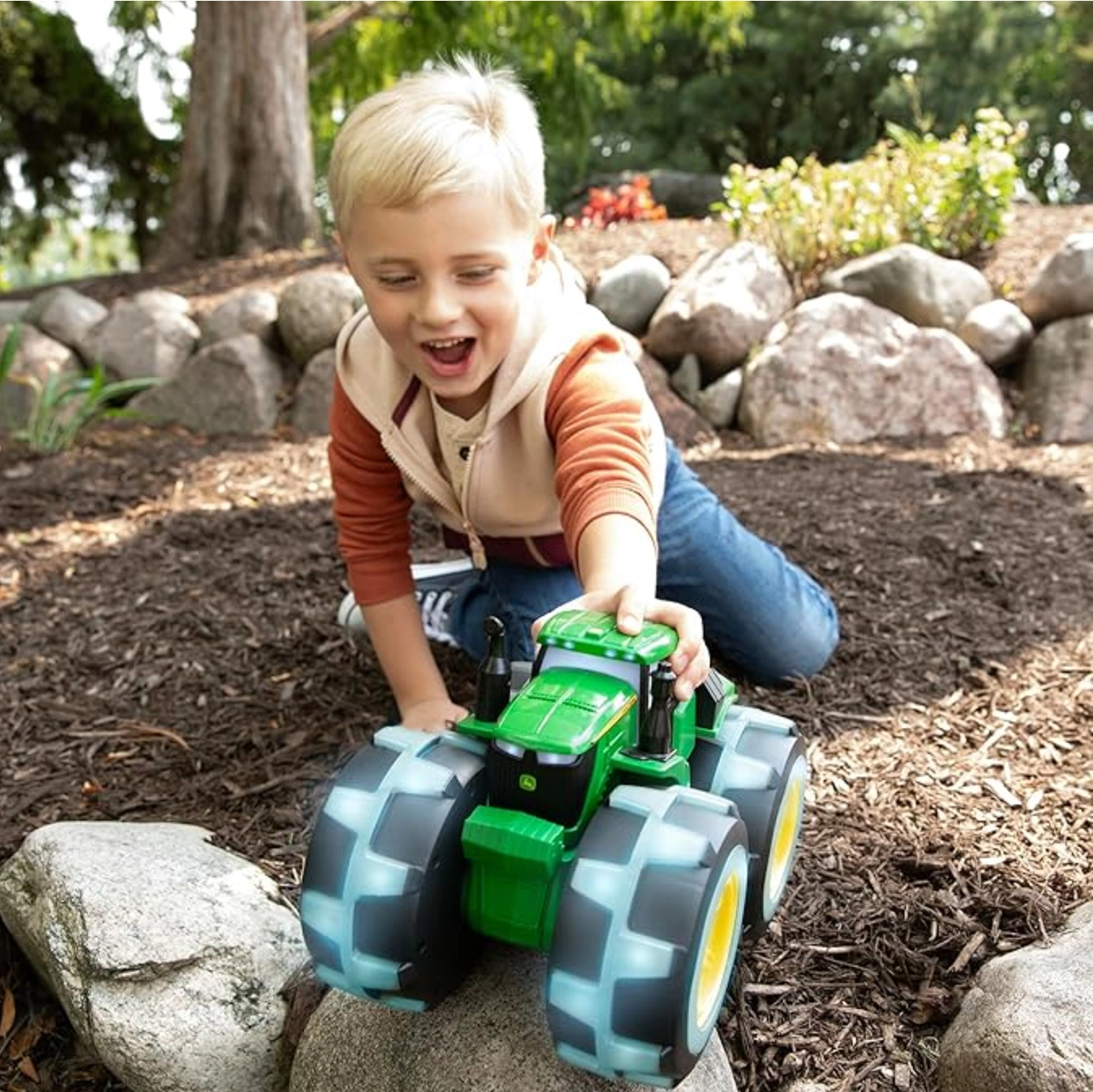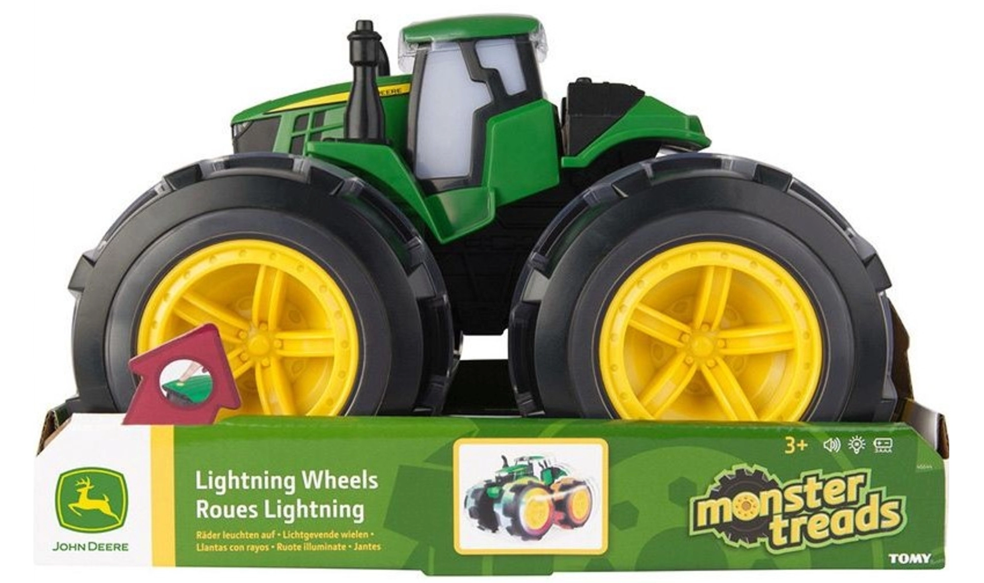 Žalias pagal John Deere licenciją pagamintas Tomy traktorius siūlo šviečiančius ratus, garsinius efektus ir patvarią konstrukciją žaidimams namuose ir lauke. Tereikia paspausti vieną mygtuką ant stogo ir mėgautis LED šviesos efektais bei realistiškais variklio garsais. Dideli bekelės ratai su puikiu sukibimu lengvai įveiks tiek kilimus, tiek sodą.