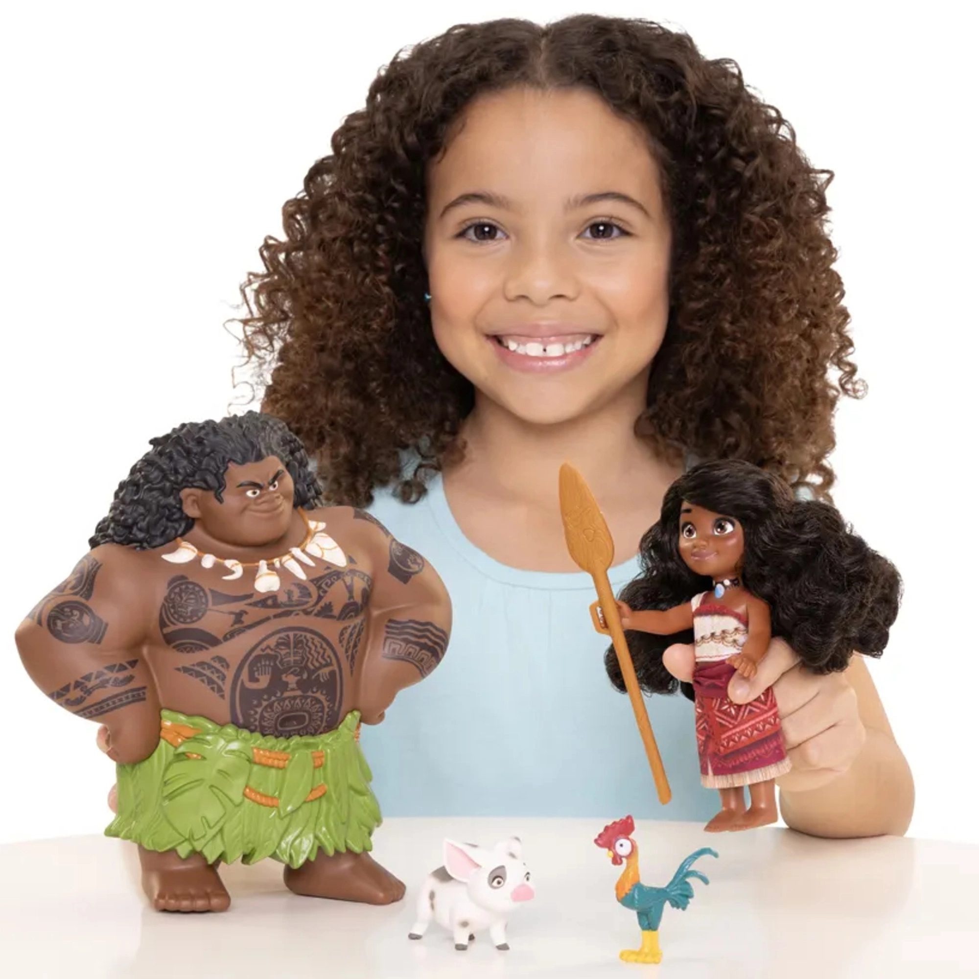 - Pilnas personažų rinkinys: Vaiana, Maui, paršiukas Pua ir gaidys Heihei.