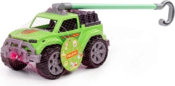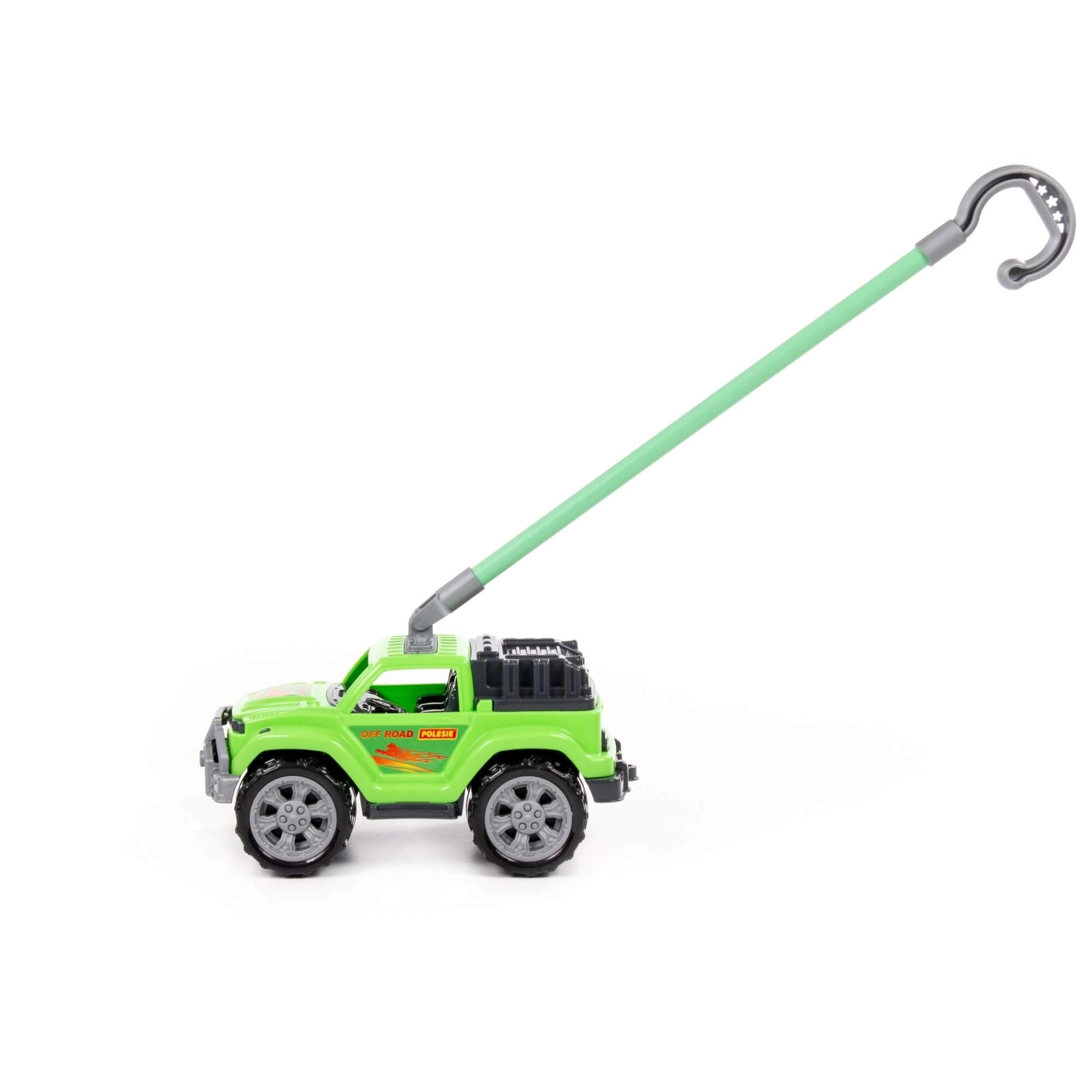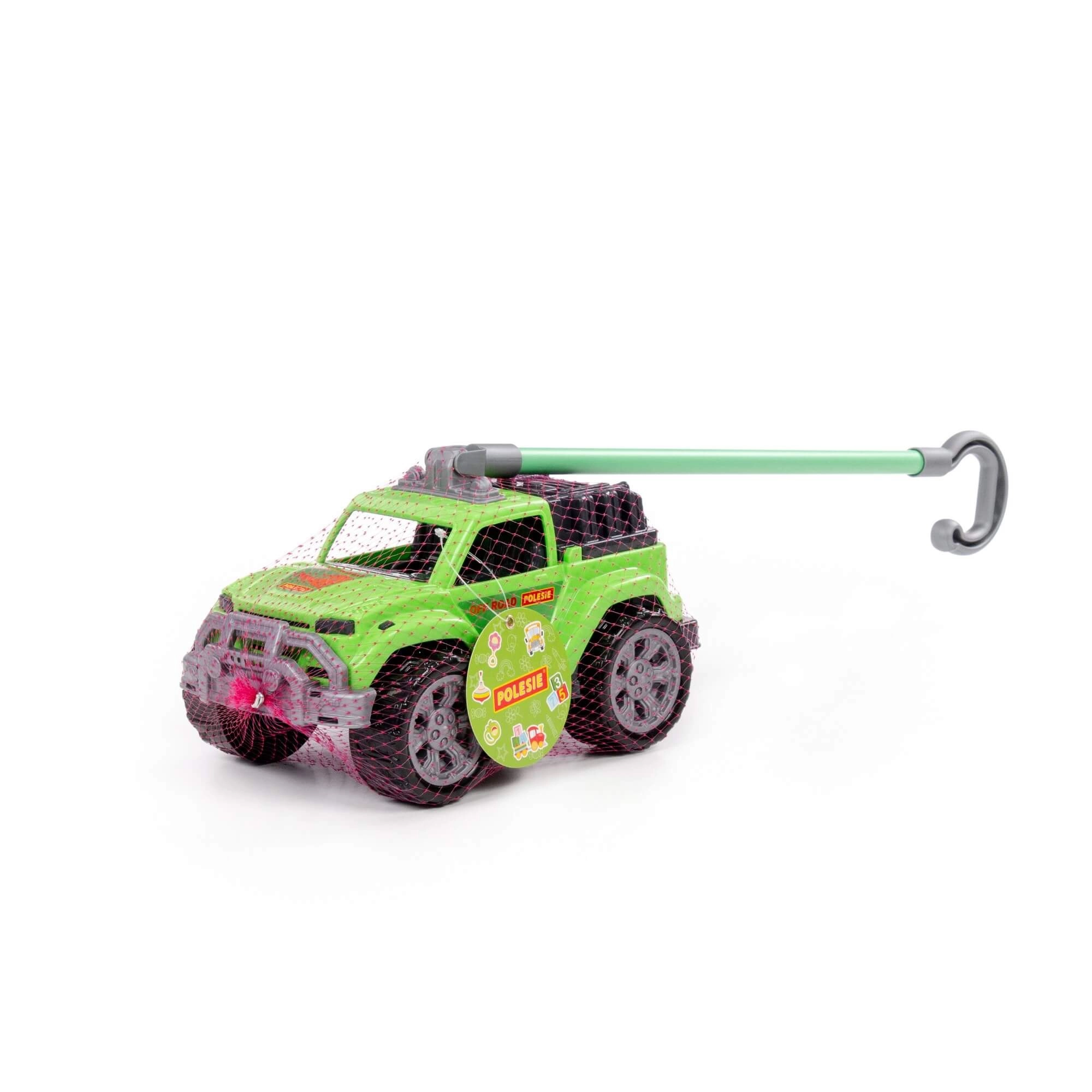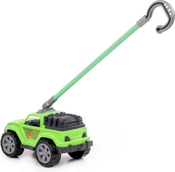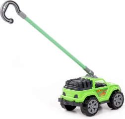 Žalias vaikiškas stumdomas automobilis, įkvėptas visureigių, siūlo patvarų korpusą, didelį ratų komplektą važiavimui įvairiais paviršiais ir nuimamą ilgą rankeną, kad būtų lengva stumti ar tempti. Puikiai tinka smulkiajai motorikai lavinti ir kūrybiškam žaidimui namuose ir lauke.