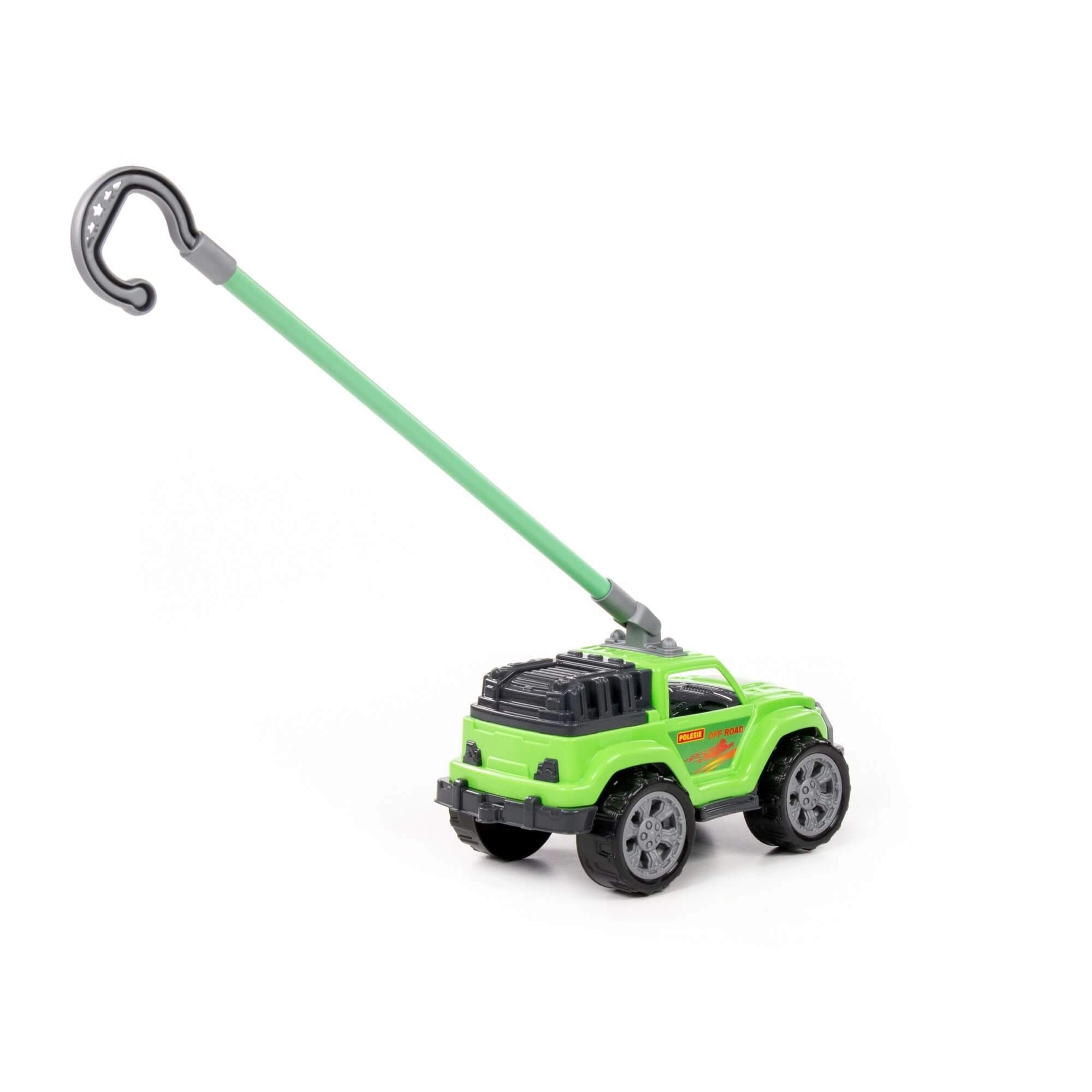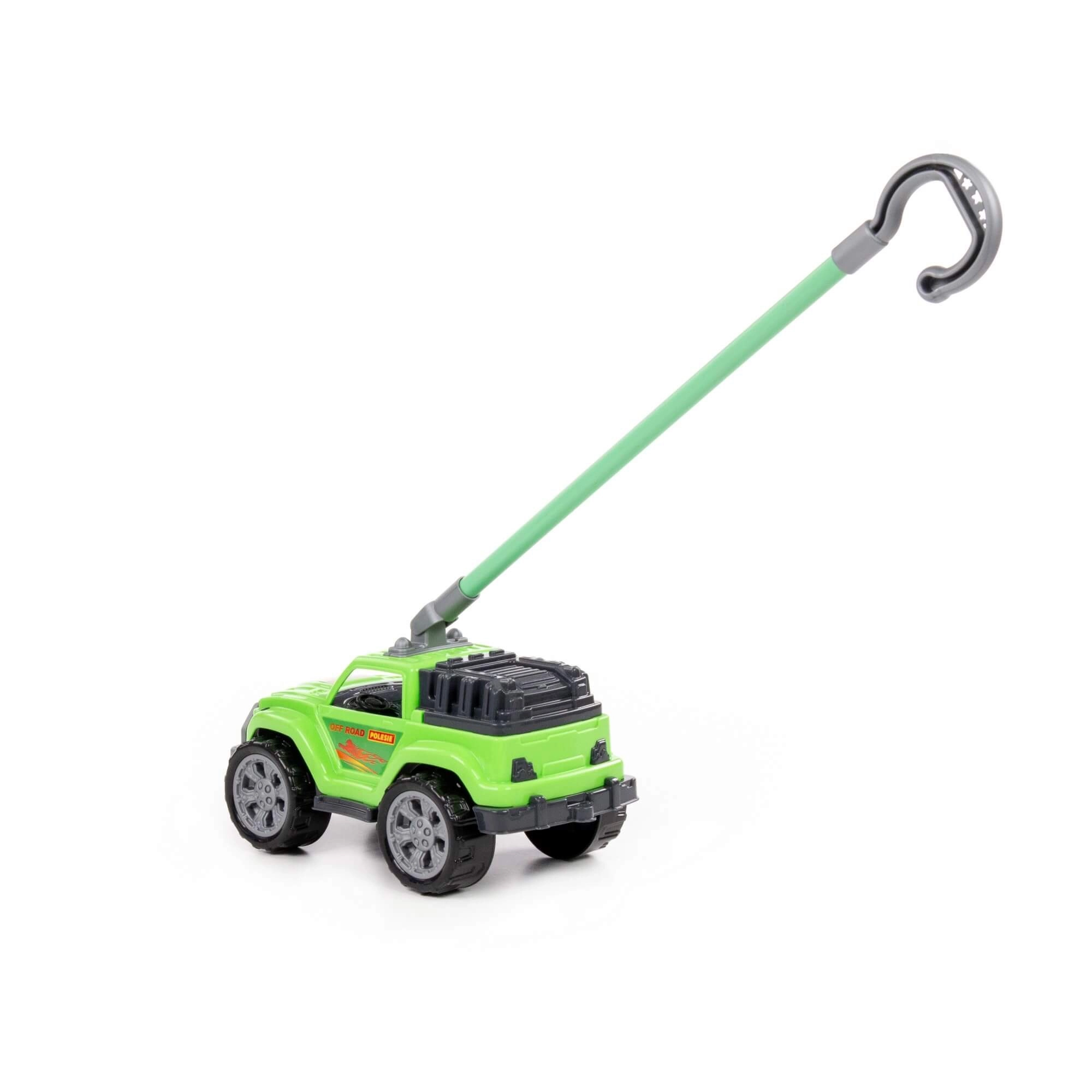 Šis tvirtas žalias stumdomas automobilis pradžiugins mažus vairuotojus realistiška visureigio išvaizda, dideliais ratais ir praktiška nuimama rankena su kabliuko formos laikikliu. Dėl stabilios konstrukcijos ir sklandžiai riedančių ratų jį lengva valdyti ant šaligatvio, žolės ar namų grindų.