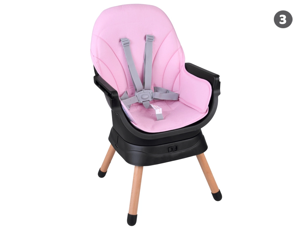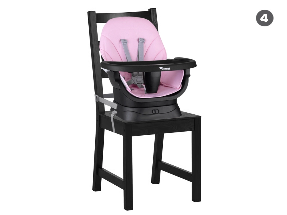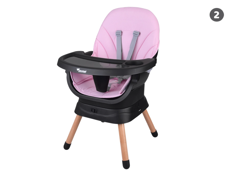 Modulinė sistema leidžia greitai perstatyti be įrankių: aukšta maitinimo kėdutė, žema kėdutė su padėklu, atskiras fotelis, priedas ant valgomojo kėdės su tvirtinimo diržais, aukštas taburetėlis ir žemas suoliukas. Erdvę po kėdute papildo praktiškas krepšelis smulkmenoms.
