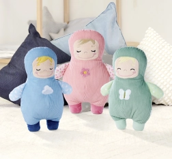 Ši pliušinė lėlė, primenanti miegantį kūdikį, sukurta kasdieniam glaudimuisi ir švelniam žaidimui. Minkštas paviršius, siuvinėtos detalės ir pastelinės spalvos paverčia ją saugiais ir patogiais žaislais patiems mažiausiems.