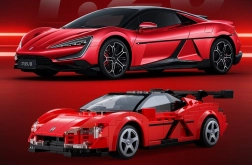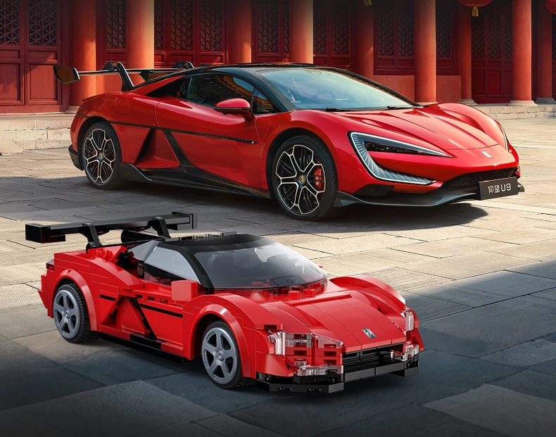 Raudona kėbulo spalva su spauda, skaidrūs žibintai ir didelis galinis sparnas tikroviškai atkuria sportinio automobilio YANGWANG U9 išvaizdą.