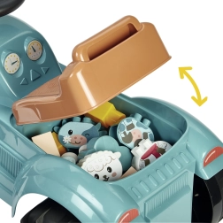 Į komplektą įeina 15 statybinių kaladėlių, iš kurių vaikas lengvai sudės karvytę ir avelę, taip pat kitos detalės kūrybiniam statymui. Rinkinys padeda lavinti smulkiąją ir stambiąją motoriką, koordinaciją ir ūkininko vaidmenų žaidimus. Visas važiuoklis yra maždaug 86 × 32,5 cm ir idealiai tinka vaikams 12–36 mėn.